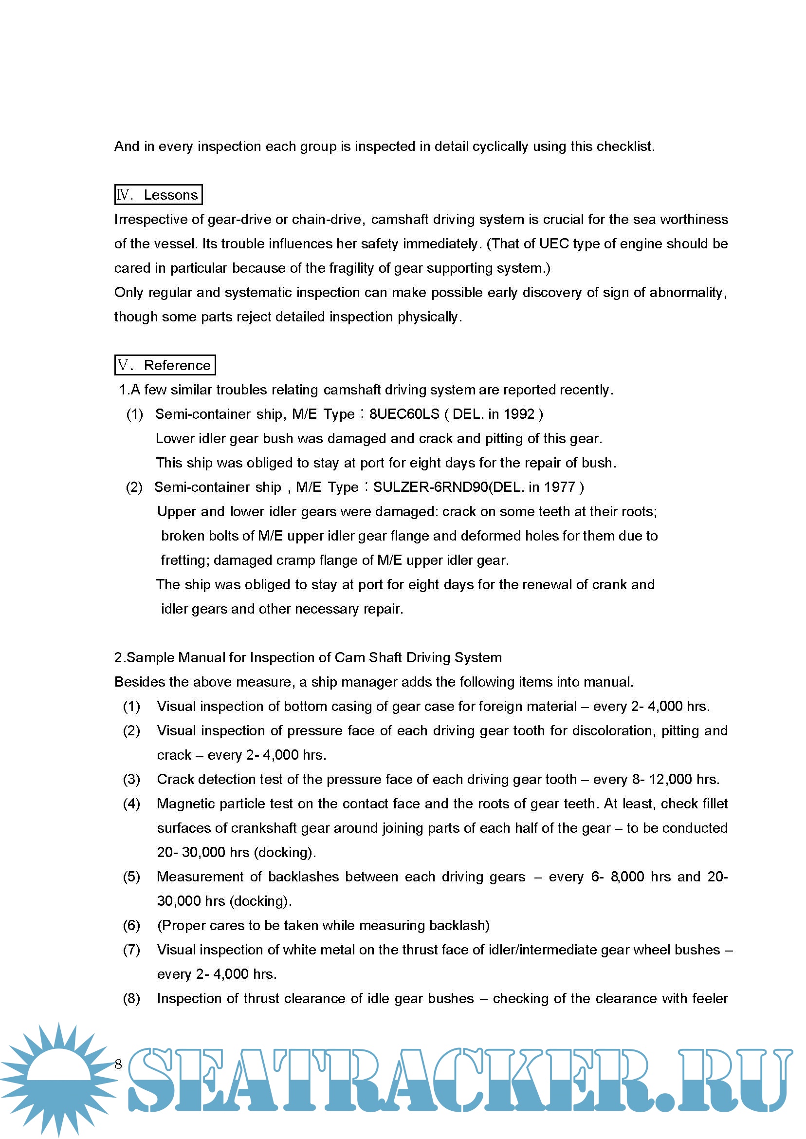 Year: 2001 Language: english Author: Mitsui O.S.K. Lines Publisher: Mitsui O.S.K. Lines Format: PDF Quality: eBook Pages count: 322 Description: We, in the group of Mitsui O.S.K. Lines, currently operate about 500 vessels. According to the statistics of vessel accidents in 2000 contained in data base for MOL-operated vessels (refer to the attached charts), the incidence of accidents (breakdowns which actually affected ships’ schedules or those which had such a potential) was as high as 0.94 case per vessel. Ever since 1996 when statistics were first compiled, about 40% of the accidents which occurred with vessels under our operation, are related to ships’ machinery. It is said that about 80% of accidents with ships are attributed to human error but this statistical figure is not directly applicable to engine-related damage. It is because the engine of a ship is a “man-machine system” operated with man and machinery complementing each other and, as a result, accidents of machinery always involve human beings. The causes of engine accidents are varied, but statistics of engine damage show that structural defects, and problems with design or workmanship, largely account for such accidents. We do not encounter, with a high frequency, cases where the mishandling of equipment and instruments on the part of crew members directly contributed to accidents. There is also a tendency for similar accidents to occur on board many vessels with similar specifications. Essentially, even if it is possible to reduce the number of failures of equipment and instruments or human errors, it is impossible to bring it to “zero”. It is, therefore, important that, in order to prevent accidents, a breakdown or failure, if incurred, be averted from developing into a serious event. This means that crew members are required to recognize abnormal engine conditions as such as early as possible and stop or arrest, in the process, the flow toward degradation of the failure to a seriousaccident. In order to realize that various phenomena (e.g., temperature, sound, pressure, leak, discoloration) which appear in equipment and instruments are signs which may precede subsequent accidents, experience as a professional is naturally required. However, in reality, there is a limit to the experience one engineer can have in the performance of his duties on board vessels. It is, therefore, important to sufficiently analyze accidents which have occurred on board other vessels and utilize such analyses as lessons to prevent accidents of similar kinds. The Marine Engineering Group, Marine Division, shoulders the role to make continued efforts to investigate into causes of machinery damage and, on the basis of such investigations, determine guidelines for the operation of engines on board vessels under our operation. This time, we have put a large number of engine trouble cases in perspective in terms of the cause, countermeasure and lesson, to compile this set of “Engine Accident Cases”. We request you to take full advantage of this material for training those who embark vessels under MOL’s operation as engineers, thereby to prevent the occurrence of engine-related accidents.