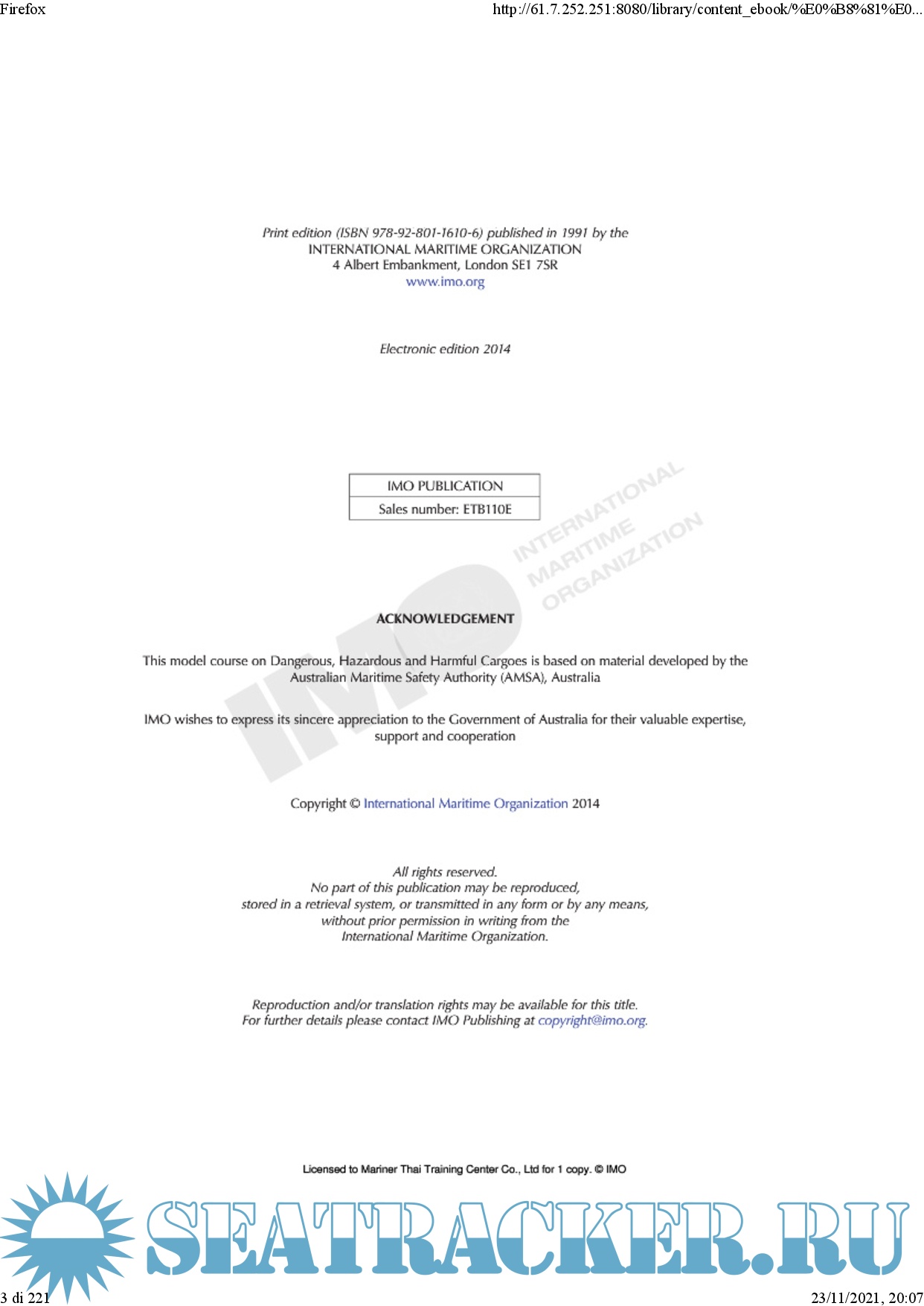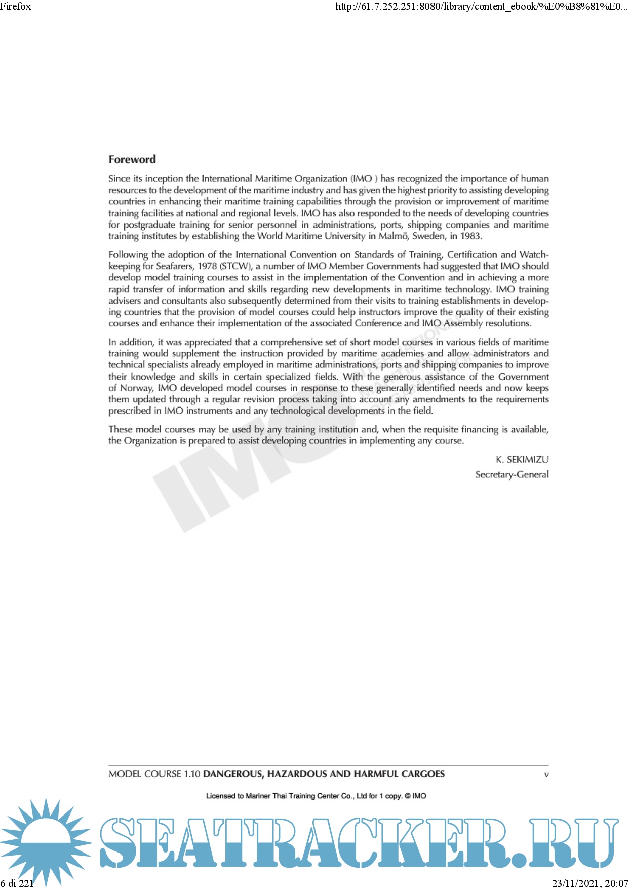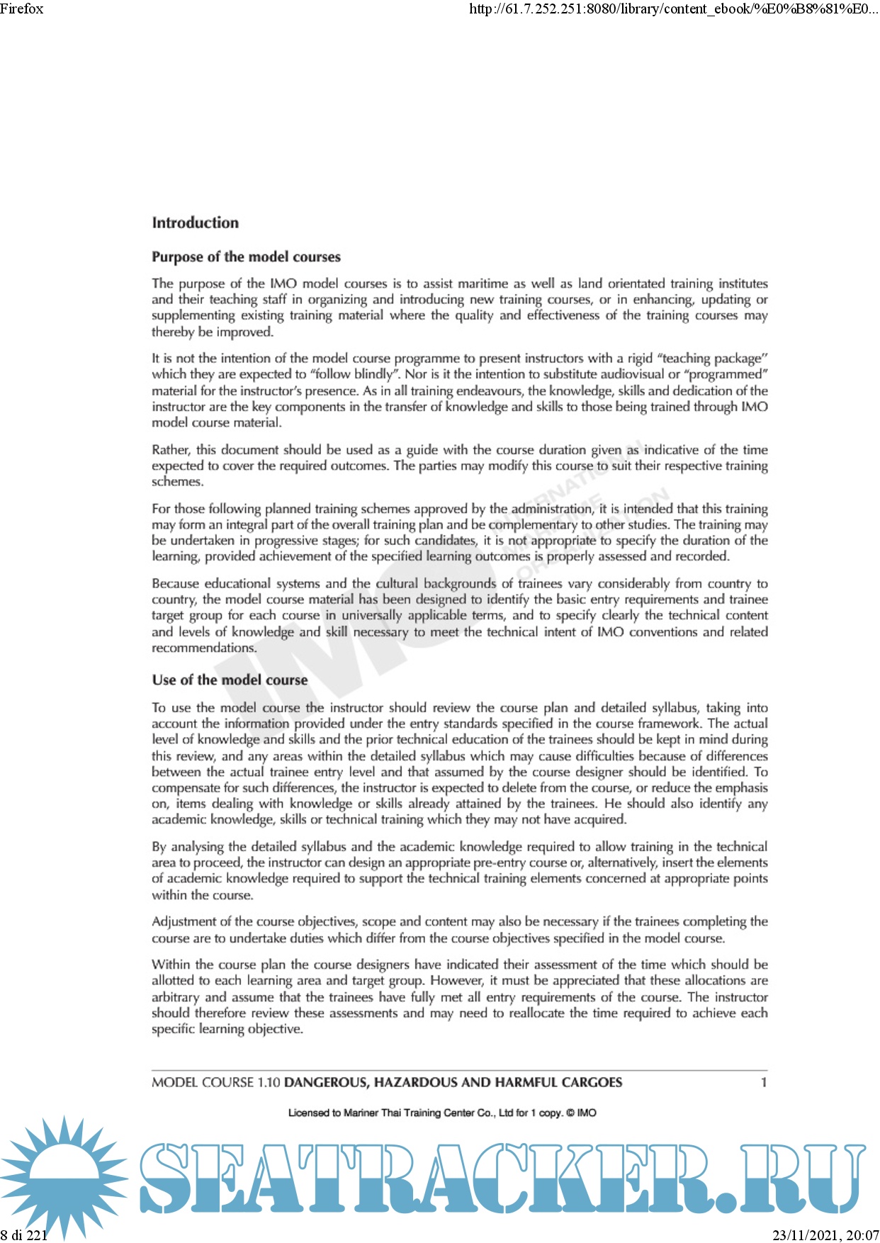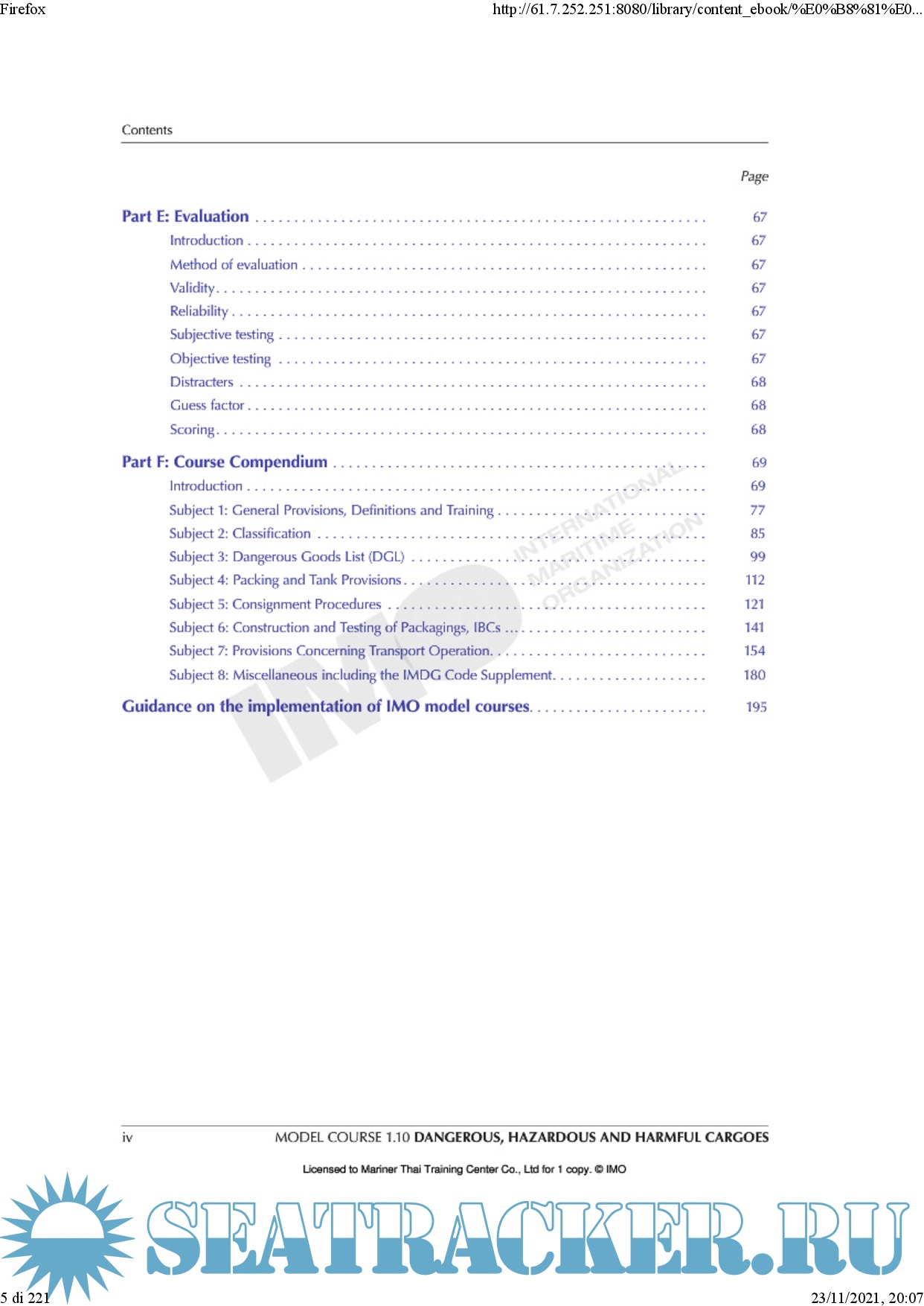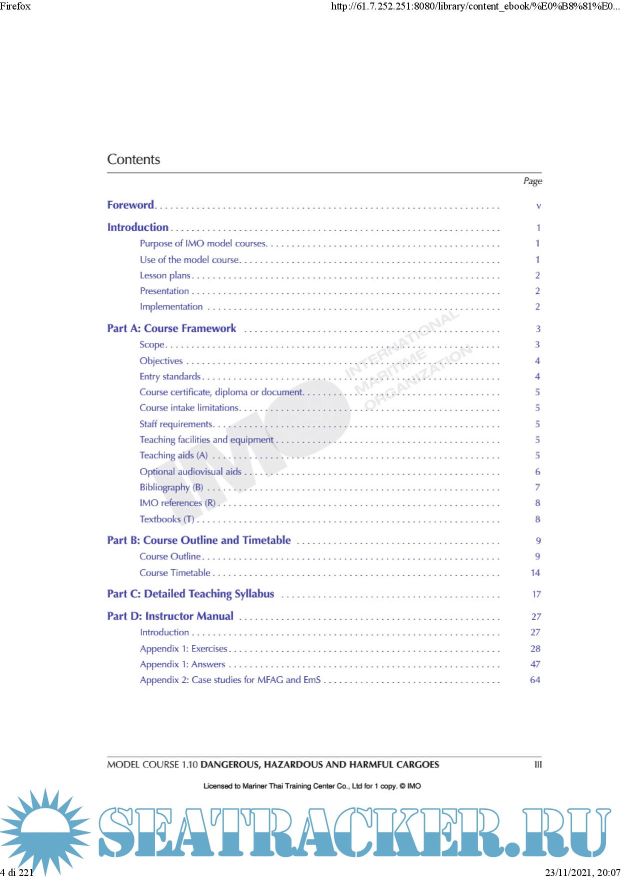 Year: 2014 Language: english Author: IMO Genre: Guide Format: PDF Quality: eBook (NO OCR) Pages count: 221 Description: Model Course 1.10 Dangerous - hazardous and harmful cargoes - 2014 Ed