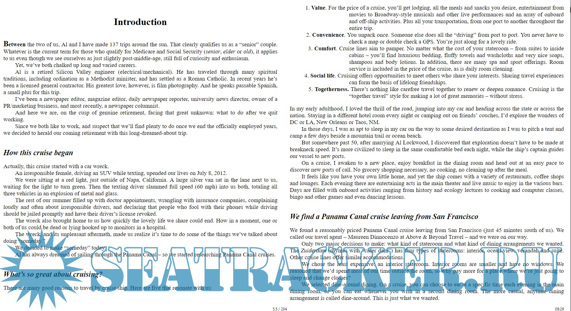 Year: 2013 Language: english Author: Al Lockwood & Sunny Lockwood Format: EPUB Quality: eBook Pages count: 204 Description: Who would have guessed that it would have taken an almost fatal car accident to motivate Al and Sunny Lockwood to take a cruise ship vacation to the Panama Canal? Riveted by their near death experience. this charming couple decided to make their bucket list dream cruise vacation come true, and now they want to share it with you! Come along with them as they share intimate details of their 17-day odyssey from San Francisco to Fort Lauderdale via the Panama Canal. Sunny provides the facts. Al adds delicious humor. A perfect recipe for cruise travel fun! Get a firsthand look into what ocean cruising is really like: the service, the staterooms, the entertainment, the surprises, and of course the food -- from endless buffets to amazing gourmet dinners and decadent desserts, Al’s enthusiastic descriptions will have your mouth watering. Stand on the bow of Holland America’s MS Zuiderdam with Al and Sunny as they share the sights, sounds and feelings of transiting the Canal; watch as the sun rises over the Pacific Ocean and then sets into the Atlantic on the same day. Miraculous! Let Al and Sunny be your guides to exotic ports of call such as: Zihuatanejo, Mexico, Putarenas, Costa Rica, Cartagena, Colombia and Half Moon Cay in the Bahamas. Learn about the building of the Panama Canal and how the locks actually work as huge, modern ships squeeze into 100-year-old chambers to take the world’s most famous short cut. Finalist in the 2014 National Indie Excellence Awards Whether you are thinking of a Panama Canal cruise, looking for a humorous and heart-felt travel memoir, or are an armchair traveler seeking a fun and entertaining read about cruise travel, you are going to love Cruising Panama’s Canal. Order your copy today!