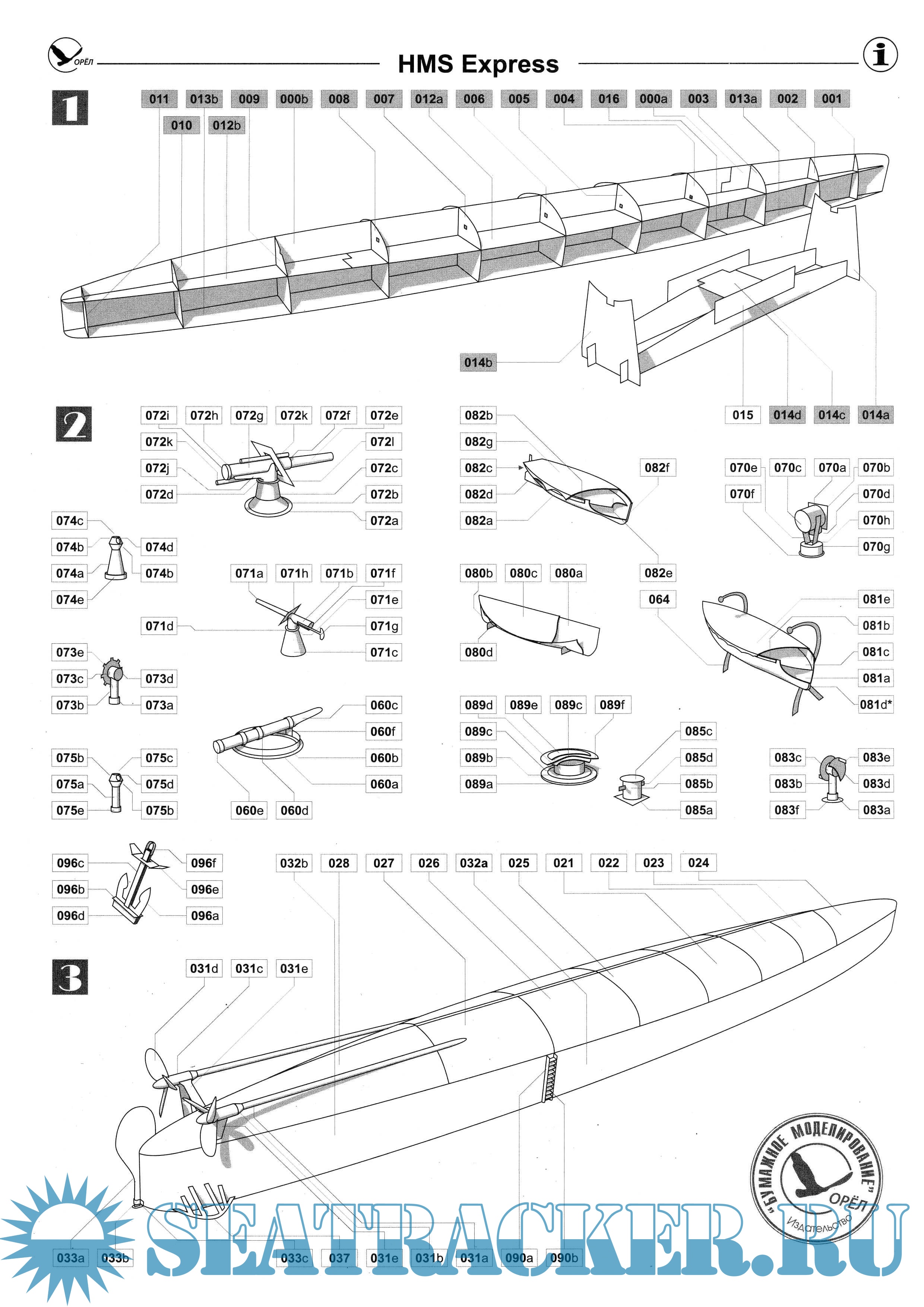 14 листов формата А4 цветных выкроек для создания модели миноносца "Express" по состоянию на 1902 год в масштабе 1:200. Инструкция на русском, английском, немецком и польском языках.Скриншоты
