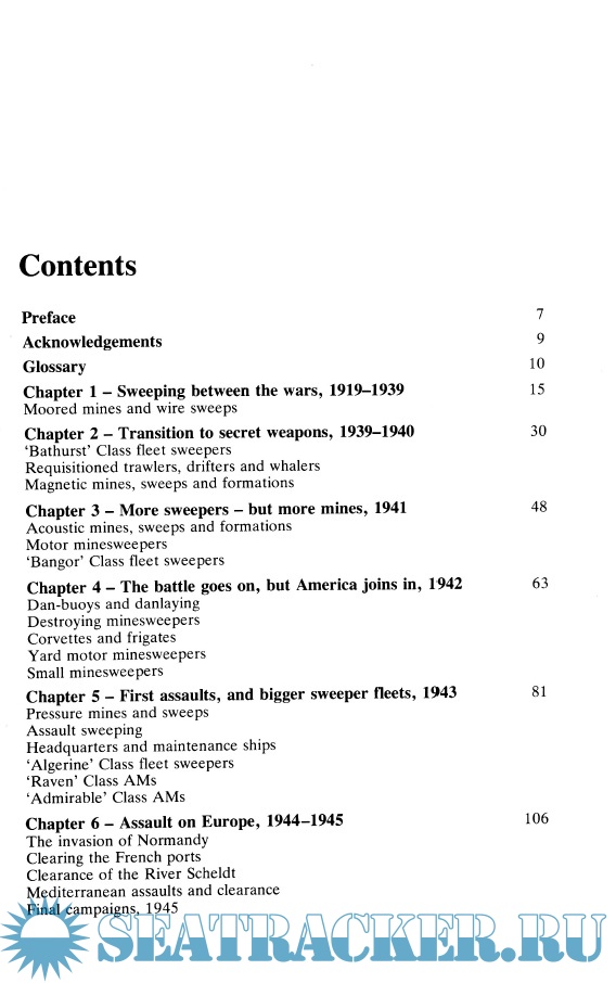 Description: A useful general history, concentrating on the European theater with more detailed accounts of specific operations (e.g. the clearing of the Scheldt) and some anecdotal content. It describes the mines themselves, together with sweeping techniques and formations. Appendices include profiles of minesweeper classes, operational strengths by year, comparative specifications, war losses, and other technical data.
