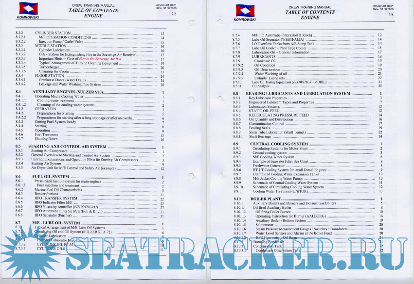 Year: 2006 Language: english Author: Komrowski Genre: Manual Format: PDF Quality: Scanned pages Pages count: 457 Description: This CREW TRAINING MANUAL is a comprehensive overview manual for our fleet. We hope that this manual will be an useful and informative reference to assist you throughout the familiarization and training phase, as well as during the daily job routines. Upon creating this manual, we have tried to explain everything by understandable definitions and terms; for the engineers as well as for the assisting crew members. One thing must be quite clear: This documentation is no substitute for existing supplier documentations with very detailed information. Above all, using information and instructions from this munuul needs the absolute required education and experience in ship technology, according to the rank of the crew member! Beside some step by step instructions of special procedures, this documentation will give you also deep background knowledge of the individual technical systems on board. This documentation is the result of a network between experienced ship crew members (master, officers, engineers and electricians) and the company support by the shipmanagement department as well as by the support of system suppliers. This will not be another manual signed in checklist and tucked somewhere into a comer and unread! Because here you can find compiled information about the ship (ship class) which are usually not available in suppliers manuals! Two of our main tasks are, to keep the technical equipment in good running condition and to get knowledge how to proceed under different and difficult circumstances. Emergency situations require quick decisions and procedures that have to be carried out correctly. And those quick decisions can only be based on deep knowledge of technical systems. Don't let us forget the personal respect between all of us, independent from nationality or skin colour. Let us remember that authority and responsibility are basic items of safe and successful ship operation! One more word about job philosophy. If we think that something is going wrong in our world we must remember that the best way to find another direction is, if we understand that at first the necessity of the balance between privileges and duties. This must be kept as a precondition for reaching preset and desired aims!