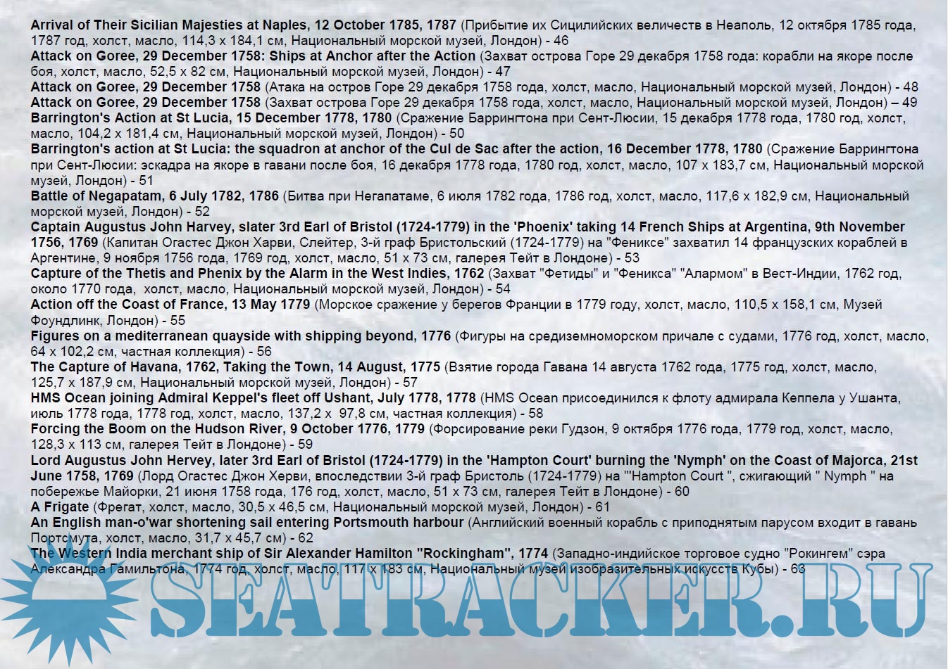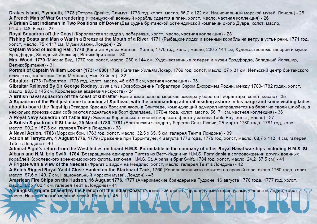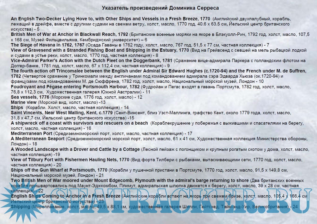 Год выпуска: 2023 Язык: русский Автор: 5sb1 (Cоставитель, переводчик и оформитель) Жанр: Другое Издание: Художники-маринисты Формат: PDF Качество: Изначально компьютерное (eBook) Количество страниц: 144 Описание: В четвёртом выпуске (Художники-маринисты) представлено 129 репродукций английского живописца французского происхождения Dominic Serres. Его работы представлены в музее Военно-морской академии США в Аннаполисе; Художественной галерее Новой Шотландии в Галифаксе; галерее Тейт в Лондоне; музее Фицуильяма в Кембридже; Национальном морском музее в Гринвиче, Национальной галерее в Дублине в других музеях, а также в частных коллекциях.