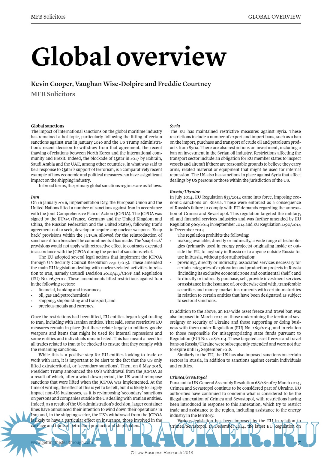 Throughout this edition, and following the unique Getting the Deal Through format, the same key questions are answered by leading practitioners in each of the jurisdictions featured. Our coverage this year includes new chapters on Marshall Islands and Mexico.