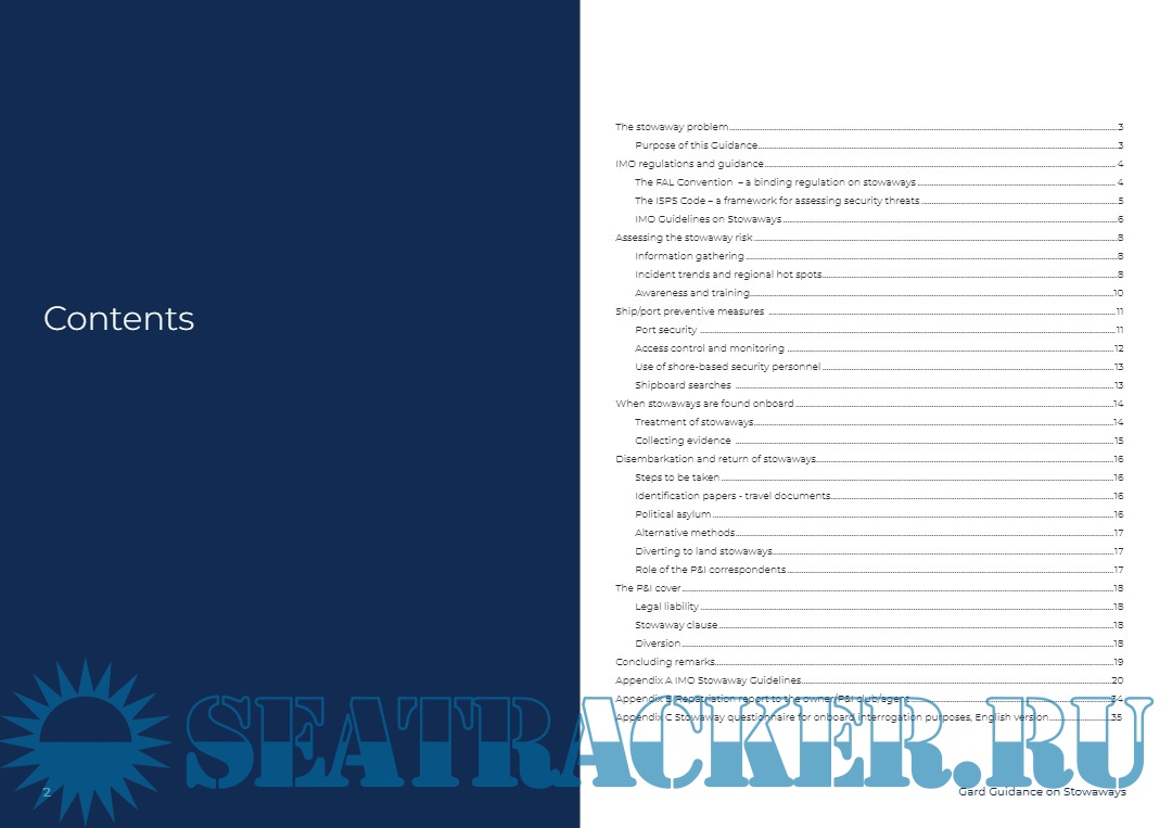 Year: 2023 Language: English Author: Gard AS Format: PDF Quality: eBook Pages count: 40 Description: This guidance is intended to assist shipowners and crews in avoiding some of the common pitfalls and problems related to stowaways. It shares some of the important lessons we have learned over the years in terms of handling stowaways, including measures that can prevent stowaways from accessing the ship, what to do if stowaways are found onboard, and some of the insurance implications.