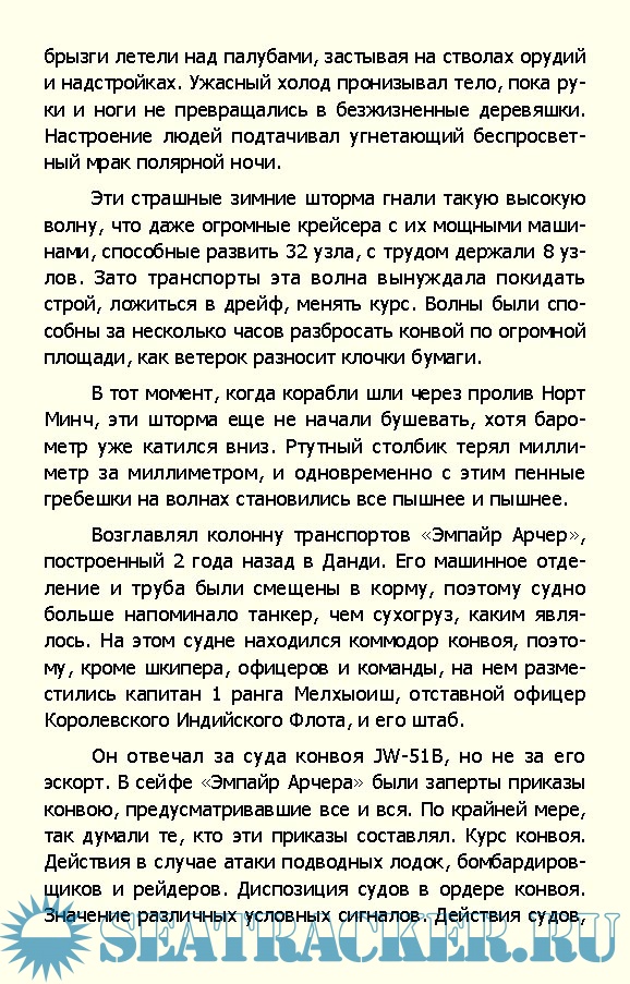Описание: В течение Второй мировой войны британскому флоту пришлось провести великое множество разнообразных операций. Одними из самых важных для Британии были конвойные битвы. При проводке одного из полярных конвоев — JW-51B — английские моряки одержали одну из самых блестящих побед в истории британского флота. Результаты Новогоднего боя оказались фантастическими: четыре слабых эсминца сумели защитить конвой, атакованный линкором, тяжелым крейсером и шестью гораздо более сильными эсминцами.