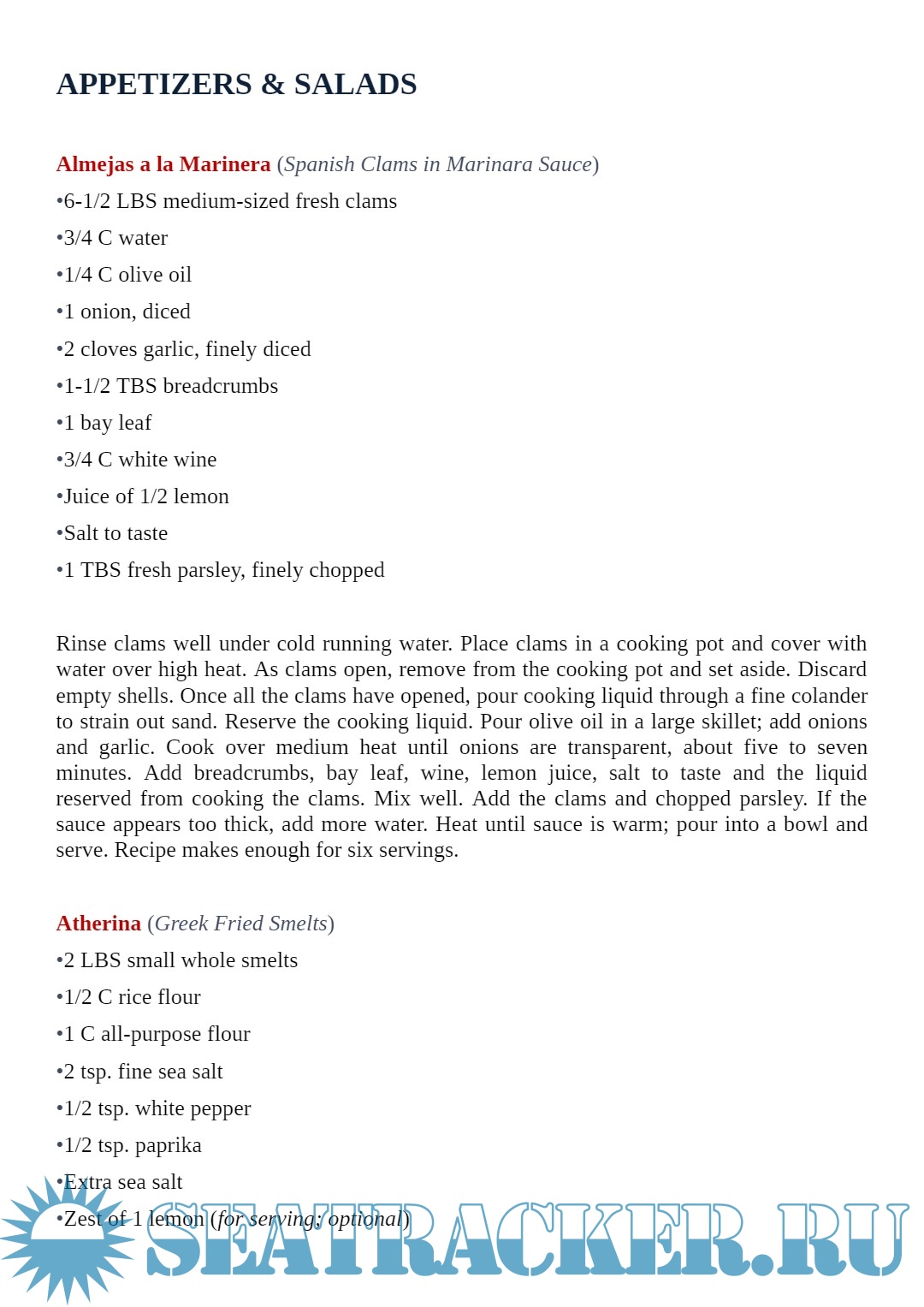 Some of the less common recipes in the Global Seafood Cookbook include Apelsinfisk (Swedish Orange Fish), Atherina (Greek Fried Smelts), Coulibiac (Russian Salmon Pie), Hut Benoua (Moroccan Snapper with Almond Paste), Labskaus (German Herring & Corned Beef with Egg), Langouste a la Vanilla (Comorian Lobster in Vanilla Sauce), Lohikeitto (Nordic Creamy Salmon Soup), Mackerel in Rhubarb Sauce (Ireland), Marmitako (Basque Tuna Stew), Ngob Pla (Thai Perch with Curry Paste), Pastai Cocos (Welsh Cockle Pie), Salata Mishwiyya (Tunisian Grilled Pepper, Tomato & Tuna Salad), Salmagundi (Pirate Grand Salad), Sledz w Smietanie (Polish Creamed Herring) and Tweed Kettle (Scottish Salmon Hash), among dozens of others.