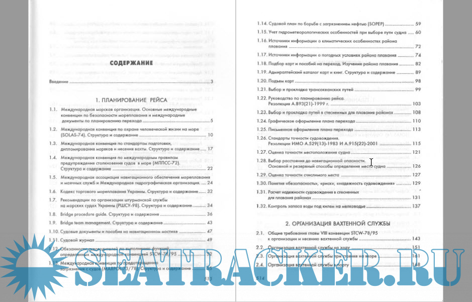 Содержание Введение 1. ПЛАНИРОВАНИЕ РЕЙСА 1.1. Международная морская организация. Основные международные конвенции по безопасности мореплавания и международные документы по планированию перехода 1.2. Международная конвенция по охране человеческой жизни на море (SOLAS-74). Структура и содержание 1.3. Международная конвенция по стандартам подготовки, дипломирования моряков и несения вахты. Структура и содержание 1.4. Международная конвенция по международным правилам предупреждения столкновения судов в море (МППСС-72). Структура и содержание 1.5. Международная ассоциация навигационного обеспечения мореплавания и маячных служб и Международная гидрографическая организация 1.6. Кодекс торгового мореплавания Украины. Структура и содержание 1.7. Рекомендации по организации штурманской службы на морских судах Украины (РШСУ-98). Структура и содержание 1.8. Bridge procedure guide. Структура и содержание 1.9. Bridge team management. Структура и содержание 1.10. Судовые документы и пособия на навигационном мостике 1.11. Судовой журнал 1.12. Обязанности судоводителей по выполнению функций, определенных международной конвенцией STCW-78/95 1.13. Международная конвенция по предотвращению загрязнения с судов (MARPOL-73/78). Структура и содержание 1.14. Судовой план по борьбе с загрязнением нефтью (SOPEP) 1.15. Учет гидрометеорологических особенностей при выборе пути судна 1.16. Источники информации о климатических особенностях района плавания 1.17. Источники информации о погодных условиях района плавания 1.18. Подбор карт и пособий на переход. Изучение района плавания 1.19. Адмиралтейский каталог карт и книг. Структура и содержание 1.20. Подъем карт 1.21. Выбор и прокладка трансокеанских путей 1.22. Руководство по планированию рейса. Резолюция А.893(21 )-1999 г 1.23. Выбор и прокладка путей в стесненных для плавания районах 1.24. Графическое оформление плана перехода 1.25. Письменное оформление плана перехода 1.26. Стандарты точности судовождения. Резолюции ИМО А.529(13)-1983 И А.915(22)-2001 1.27. Оценка точности местоположения судна 1.28. Выбор расстояния до навигационной опасности. Основной и резервный способы определения места судна 1.29. Оценка точности счислимого места 1.30. Понятия "безопасность", "риск", "надежность судовождения" 1.31. Расчет надежности судовождения в стесненных для плавания районах 1.32. Контроль запаса воды под килем на мелководье 2. ОРГАНИЗАЦИЯ ВАХТЕННОЙ СЛУЖБЫ 2.1. Общие требования главы VIII конвенции STCW-78/95 к организации и несению вахтенной службы 2.2. Организация вахтенной службы на ходу 2.3. Организация вахтенной службы при стоянке на якоре 2.4. Организация вахтенной службы в порту 2.5. Навигационные аварии. Человеческий фактор 2.6. Работа и взаимодействие судоводителей на мостике как единой команды 2.7. Управление судоводителями на навигационном мостике 2.8. Прием и высадка лоцмана 2.9. Взаимодействие капитана, вахтенных помощников и лоцмана 2.10. Права и обязанности лоцмана. Резолюция ИМО А.960(23)-2003. - "методы подготовки и работы морских лоцманов, кроме лоцманов открытого моря" 3. ПЛАВАНИЕ ПРИ ОСОБЫХ ОБСТОЯТЕЛЬСТВАХ 3.1. Учет навигационных особенностей плавания при планировании пути в зоне действия циклонов умеренных широт 3.2. Учет навигационных особенностей плавания при планировании пути в зоне действия теплого воздушного фронта 3.3. Учет навигационных особенностей плавания при планировании пути в зонах холодного фронта пе