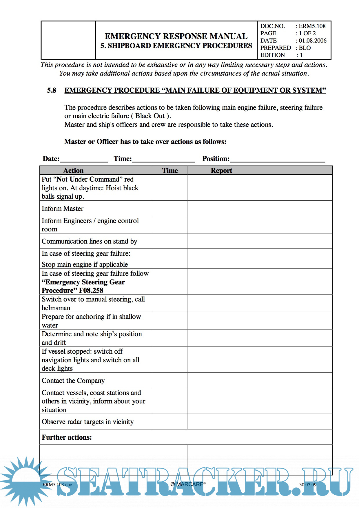 Year: 2006 Language: english Author: German ship owner Genre: Guide Format: PDF Quality: eBook Pages count: 47 Description: The objective of the 'EMERGENCY RESPONSE MANUAL' ( ERM ) is to serve as a guidance and reference for the members of the Safety Management Team (SMT) for handling of major incidents involving vessels of the company. Additional info: Company logo, adress, vessel's name, call sign are deleted (just for confidential purposes)