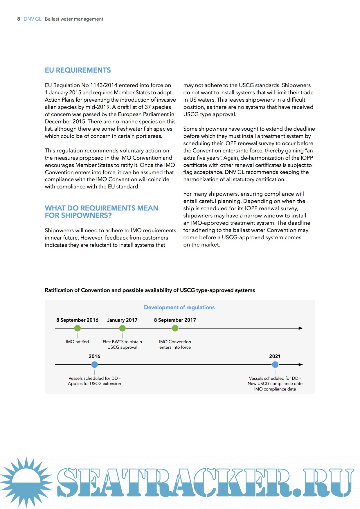 The BWM Convention was rati ed by a suf cient number of states on 8 September 2016, bringing the total gross tonnage to over 35% from the signatory states. This means the convention will enter into force 12 months later, on 8 September 2017. This implies that most vessels, which do not already have a ballast water treatment system installed, will be requested to install such equipment in the period 2017–2021 – in each case before the expiry date of the vessel’s IOPP certi cate.