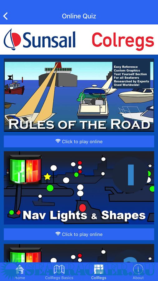 SUNSAIL SAILING SCHOOL provides at-a-glance information to help all boaters learn how to identify other vessels and the activities they are engaged in, day or night. The app clarifies which vessels have priority, with explanatory graphics and captions, in addition to the complete rules.