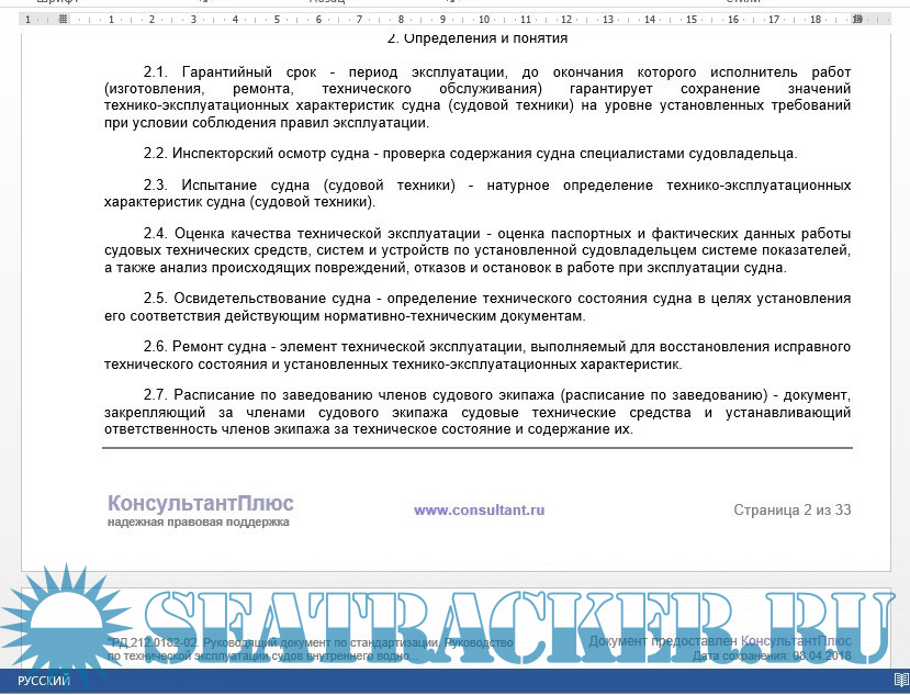Руководство по технической эксплуатации судов внутреннего водного транспорта Российской Федерации (далее - Руководство) разработано в соответствии с положениями статей 4, 14 и глав V, VI Кодекса внутреннего водного транспорта РФ от 07.03.01 N 24-ФЗ, а также Гражданского кодекса РФ и иных нормативных правовых документов.