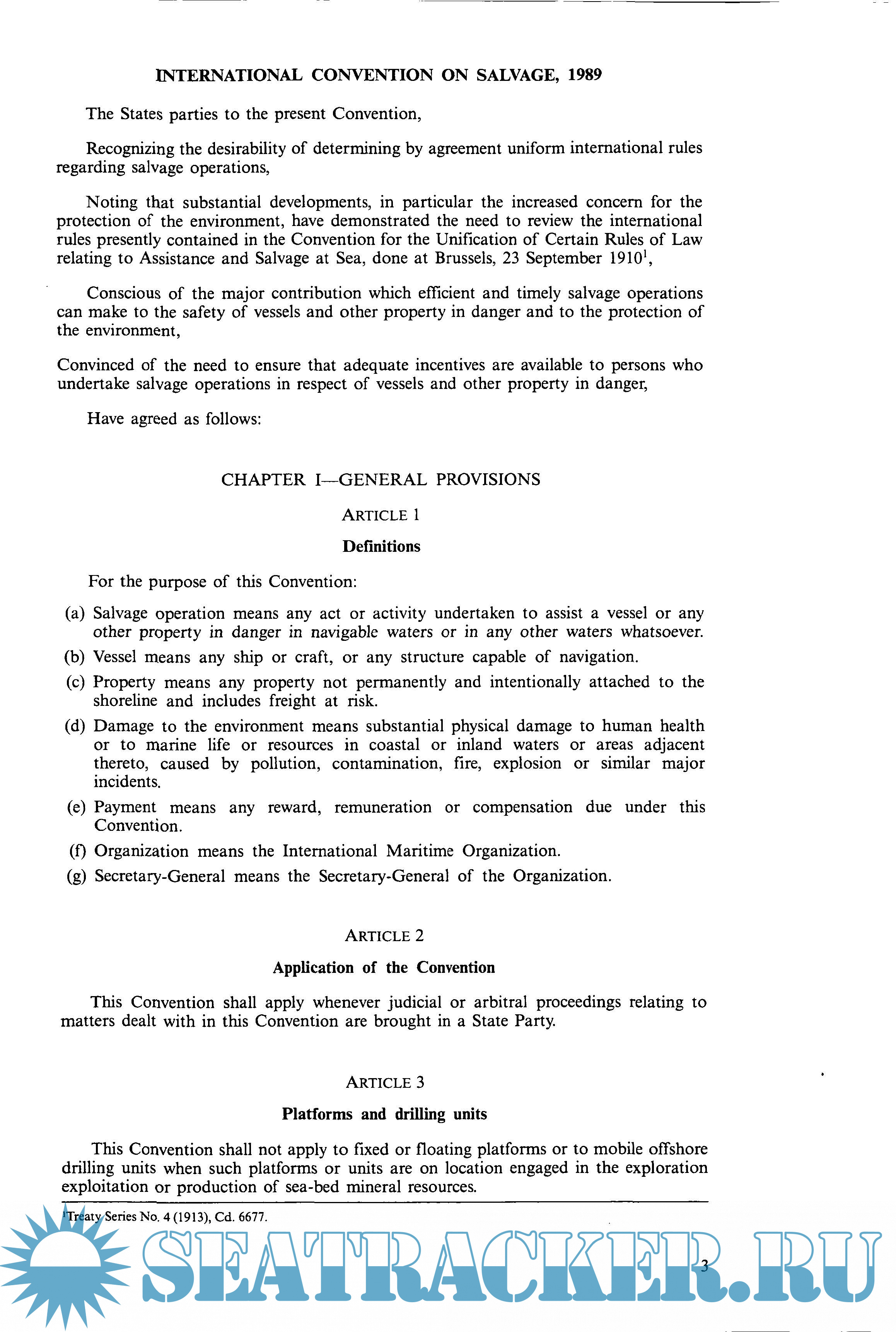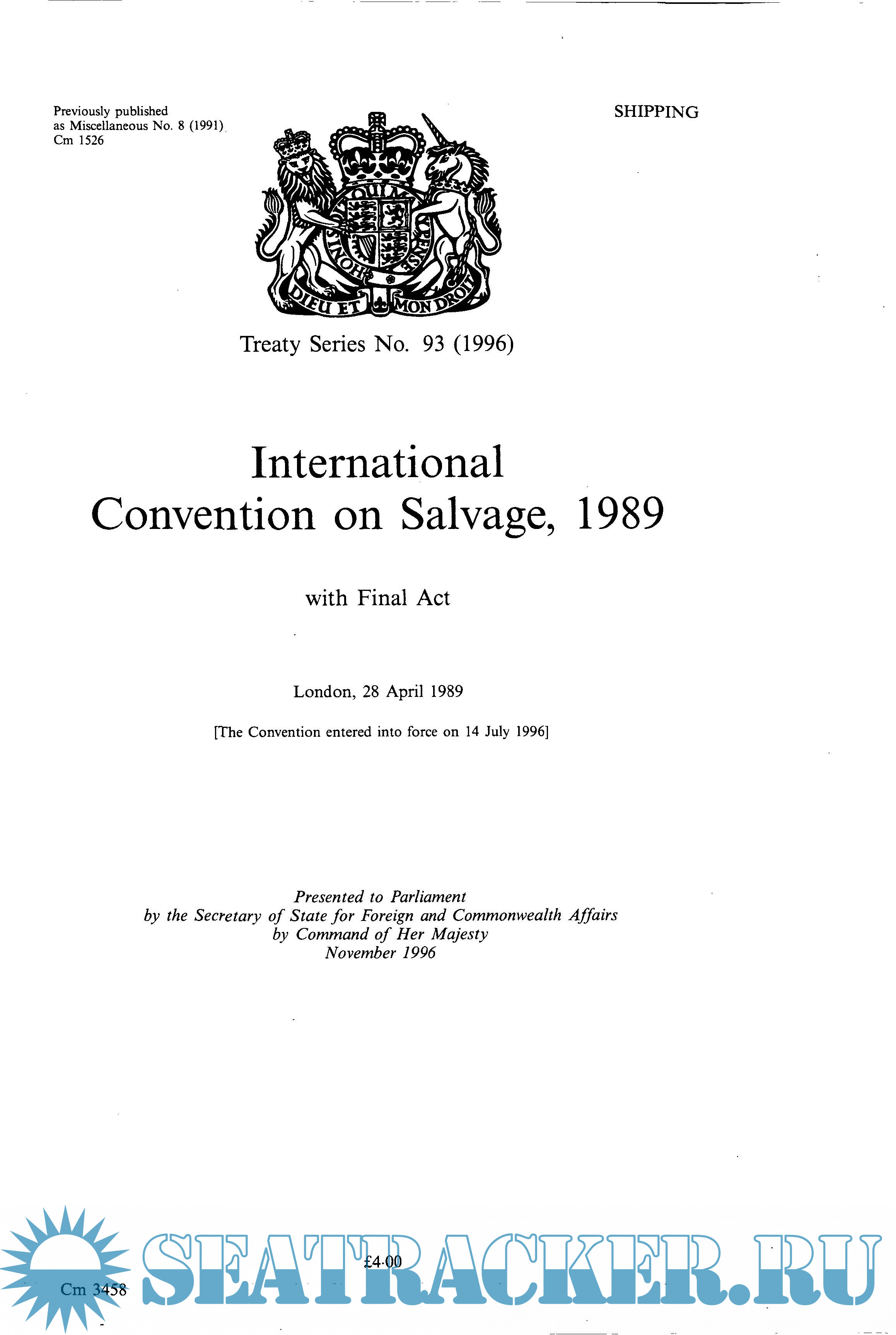 Description: The International Salvage Convention 1989, entered into force 1996 as Published The Stationery Office Limited