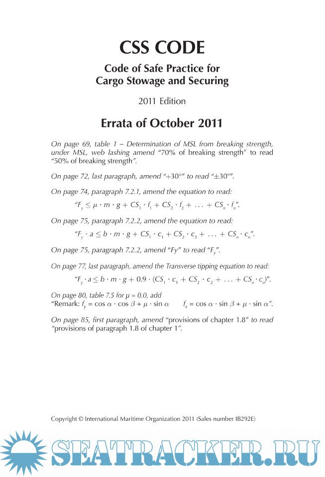 Description: The 2011 edition of the Code of Safe Practice for Cargo Stowage and Securing (CSS Code) incorporates all amendments up to and including 2010. Guidance on providing safe working conditions for securing of containers on deck.