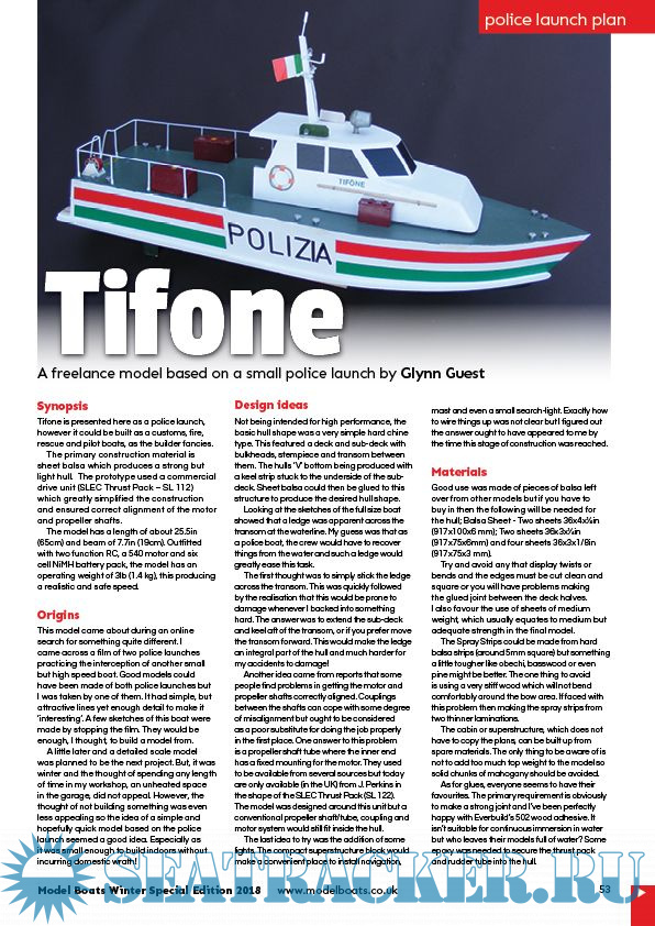 Scatch scale - A Tale of Two Tugs Wet & dry - Finishing and Sealing a Wooden Hull Classic desigh - Sea Scout Thwarts and all - Ships Boats Scale speed - Hydroplane racers Power boat plan - RAF Air Sea Rescue Launch (Whaleback) 1941-44 Police launch - Tifone Scale sail - Drawings, Scaling and Scale Maritime heritage - Portsmouth Historic Dockyard & the National Museum by Dave Wooley Classic review -\Fairey Huntsman 31 from Vintage Model Boat Company Museum report - Chatham Historic Dockyard