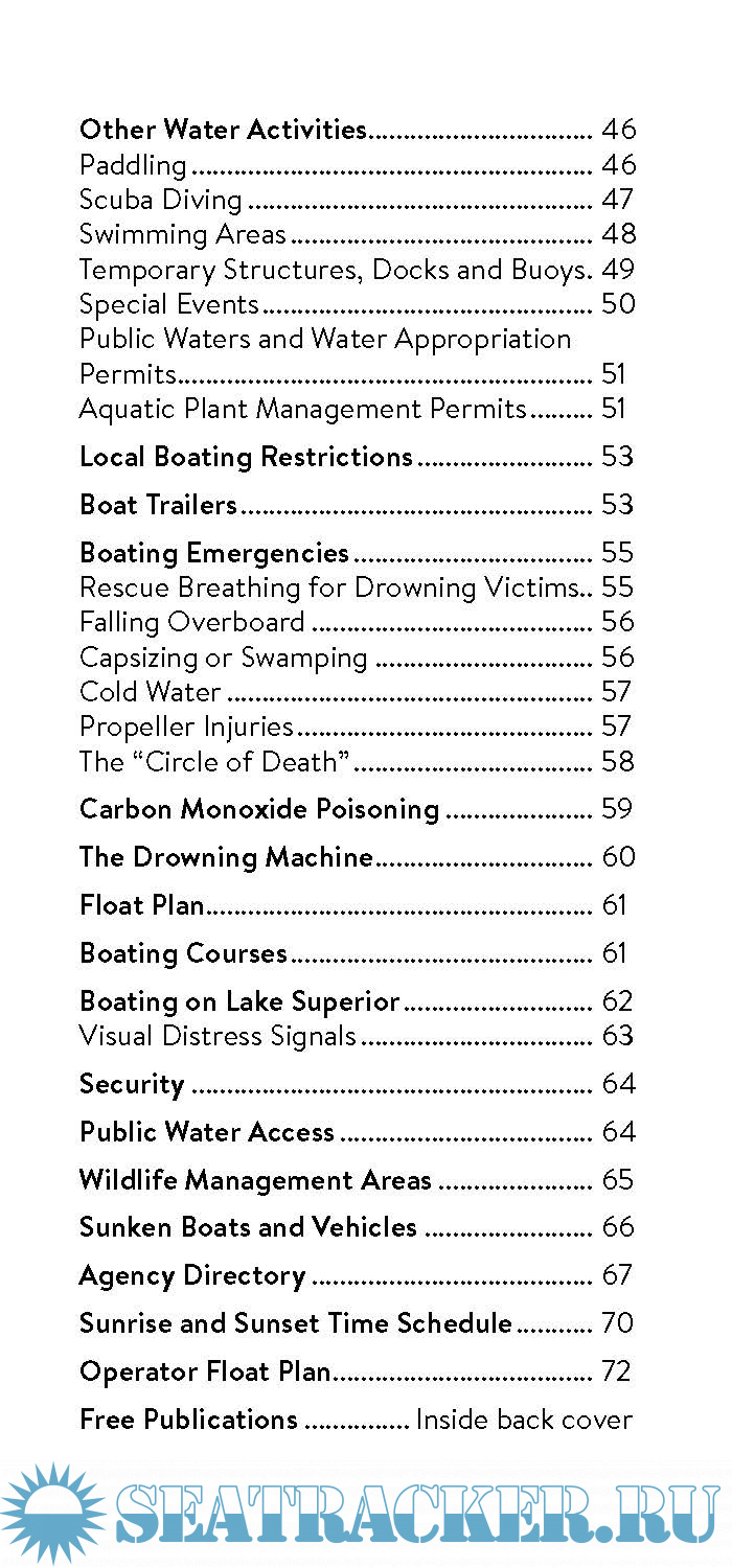 Year: 2018 Language: english Author: Department of Natural Resources (DNR) Genre: Convention (rules) Format: PDF Quality: eBook Pages count: 76 Description: Enjoying Minnesota’s lakes and rivers by boat or canoe is a wonderful privilege. That privilege comes with serious responsibilities. Fun boating is safe boating, so please read this guide thoroughly and contact the Department of Natural Resources (DNR) with any questions you may have. This book summarizes Minnesota’s boating laws and regulations. It does not present the actual laws and regulations. Laws and regulations are subject to change by the Legislature and through public hearings. Boaters may also be subject to federal and local rules and restrictions.