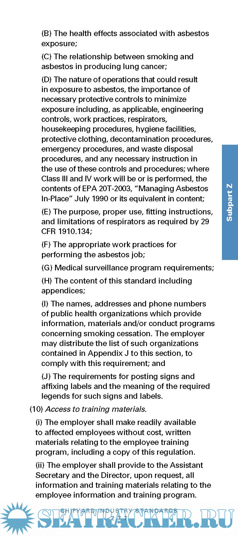 Description: This booklet contains all the safety and health standards specific to the Shipyard Industry contained in Title 29 Code of Federal Regulations (CFR) Part 1915, as of July 1, 2014. Also included are brief discussions of the following:
