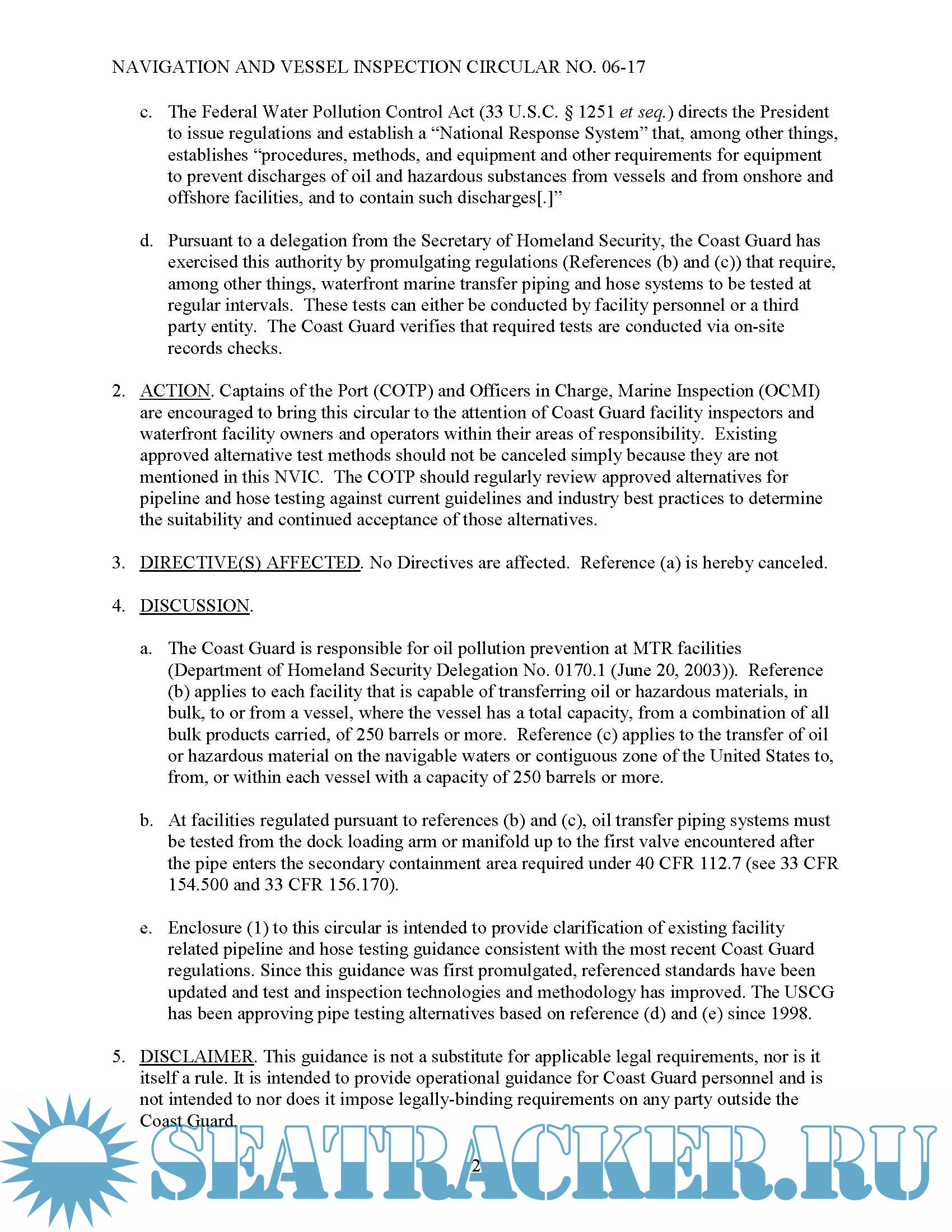 Navigation and Vessel Inspection Circular No. 06-17, Pipeline and Hose Testing Guidance for Marine Transportation Related Facilities Handling Oil or Hazardous Material in Bulk