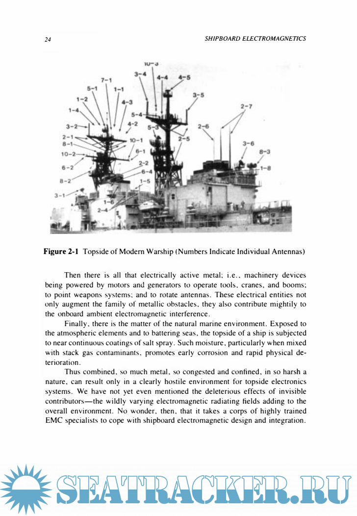 Year: 1987 Language: english Author: Law P.E. Publisher: Artech House ISBN: 0-89006-247-1 Format: PDF Quality: Scanned pages Pages count: 279 Description: Electromagnetics, in the special sense that we will be concerned with in this book, is the interaction of electric and magnetic fields associated with radiated energy - i.e., energy in the form of radiated electromagnetic fields. As such, the principal topic of interest here will be shipboard devices that emit or sense electromagnetic waves in the radio-frequency spectrum from extremely low frequencies through extremely high-frequency microwave. Other portions of the electromagnetic spectrum such as light waves (e. g. , infrared and fiber optics) will not be addressed in depth. This book endeavors to discuss each of the chief concerns of shipboard electromagnetics and to show how the problems of compatibility and interference are resolved. It is hoped that in this manner the book will provide much needed understanding and assistance to naval engineers working in ship systems design and operations.