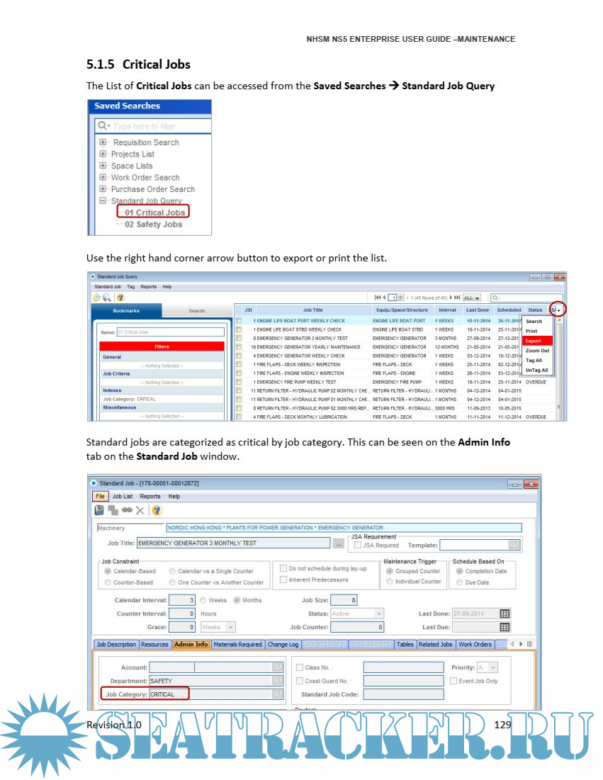 Year: 2015 Language: english Author: NHSM Genre: Guide Publisher: NHSM Edition: 1.0 Format: PDF Quality: eBook Pages count: 136 Description: NS5 Enterprise is composed of a hierarchy of equipment, supplies, parts, resources andfinancial cost centers. Attached to these are nameplate data, standard jobs, unplanned work,inventory levels, maintenance and purchasing histories. NS5 Enterprise helps with the proper planning and maintenance of a vessel and provides the accurate and comprehensive record keeping required by class societies, flag and port state regulations and financial auditors. This guide will focus on the Maintenance and Purchasing module.