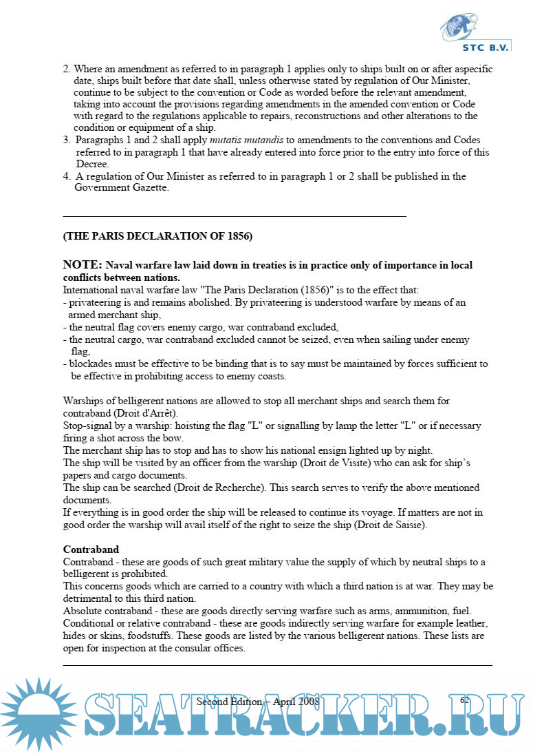 Year: 2008 Language: english Author: DGTL + IVW/TEZ Genre: Convention (rules) Publisher: Ministerie van Verkeer en Waterstaat Edition: Second Format: PDF Quality: eBook Pages count: 66 Description: Netherlands’ legislation layson the Master, the Chief Officer and the Chief Engineer many important responsibilities in regard to the ship, matters on board, the crew and the shipowner. It is therefore of great importance to gain an insight into the major Netherlands’ Acts and Decrees in which these responsibilities have been laid down. As it is an impossible task to deal with all this in detail, only outlines have been stated in this book. This will provide the Master, the Chief Officer and the Chief Engineer, which intend to work on board of any of Duch fleet vessel, with minimal requsted knowlege of Duch legislations.