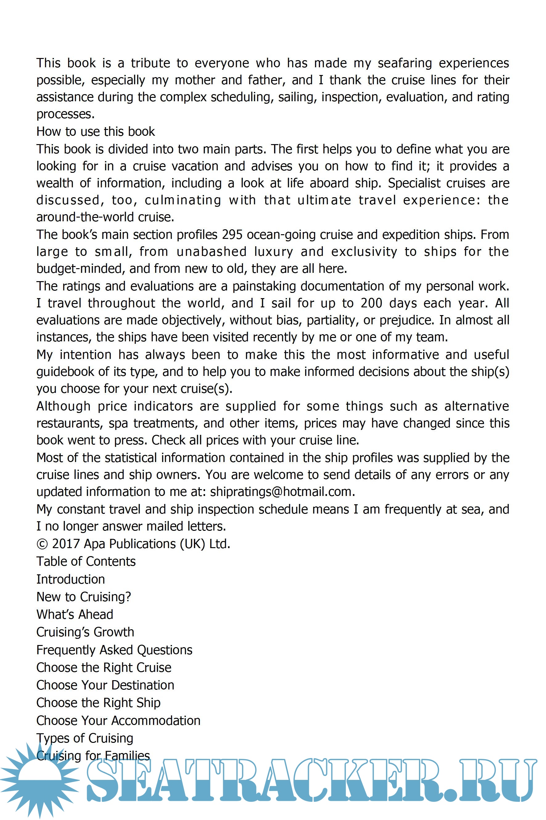 Meticulously updated every year by cruise expert Douglas Ward, it is divided into two main parts: the first helps you work out what you're looking for in a cruise holiday and how to find it; the lively text and colour photographs describe every aspect of life on board, including safety, the highs and lows of the cruise experience and how to save money. The second part contains unbiased reviews and fascinating detail of almost 300 ocean-going cruise vessels, and grades them on service, food, entertainment and facilities, using an internationally recognised ratings system.