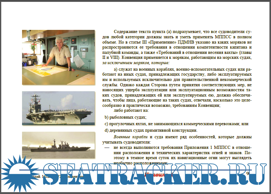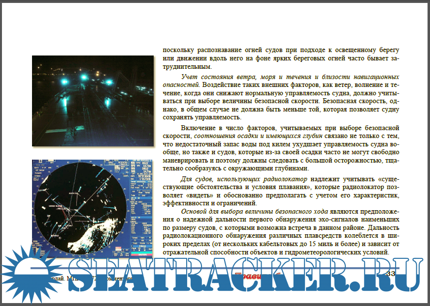 МППСС - основной документ, определяющий принципы безопасного расхождения судов. Правила обязывают каждое судно нести огни и знаки, подавать звуковые сигналы, использовать все имеющиеся средства в соот-ветствии с преобладающими обстоятельствами и условиями с тем, чтобы это позволило каждому из них:
