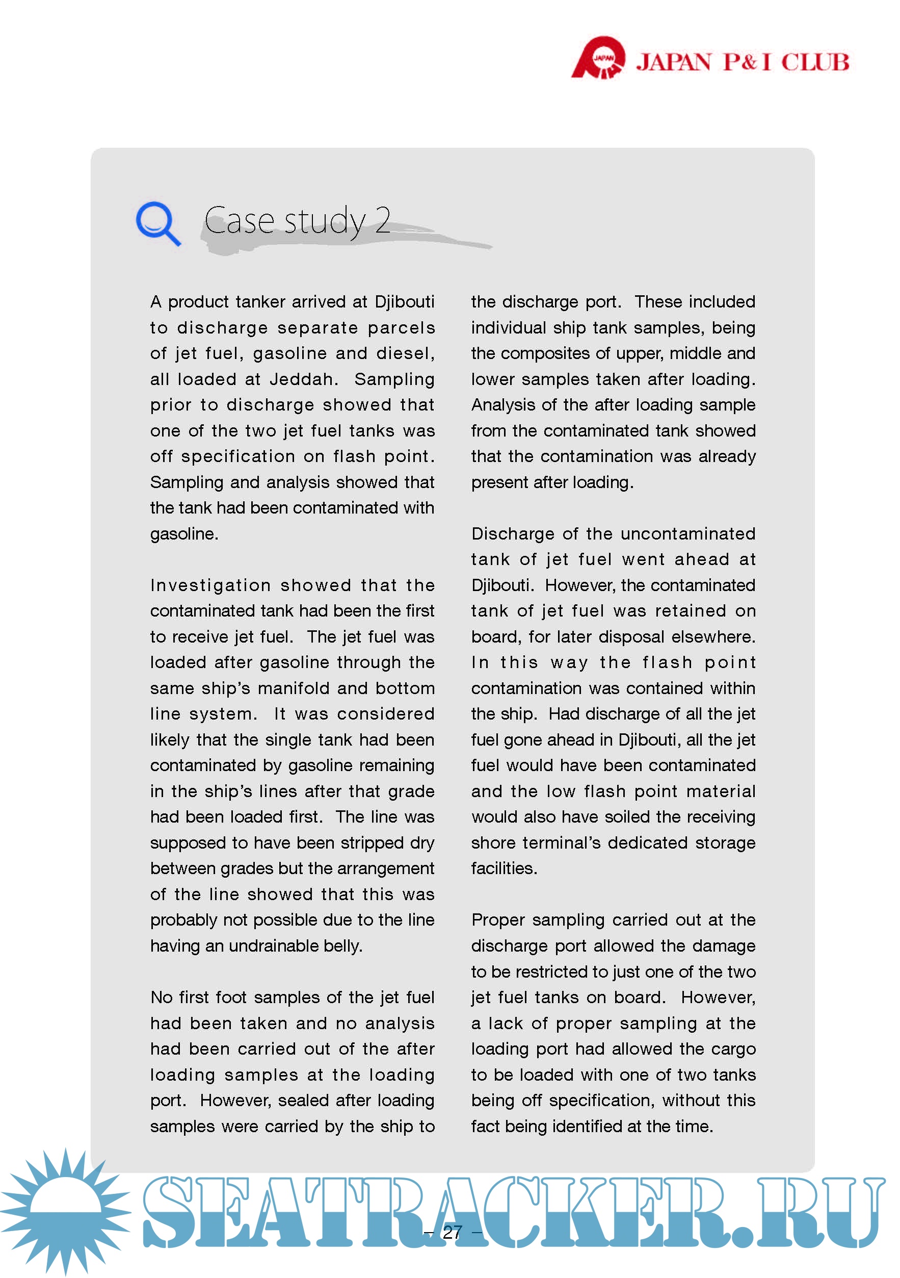 Year: 2019 Language: english Author: Japan P&I Genre: Guide Format: PDF Quality: eBook Pages count: 32 Description: Cargoes, whether dry or liquid, are stored and transported in large quantities and it is impractical and unrealistic to check every single portion of the cargo. Therefore, a smaller quantity is taken that has been shown to be statistically reliable estimate of the entire cargo. It is important to take a sample of a sufficient size, at a required frequency and often at different locations to properly represent the cargo quality. We will discuss the basics of statistics later with some examples. Sometimes but less often, samples are taken in order to determine the causation which we will discuss briefly later.