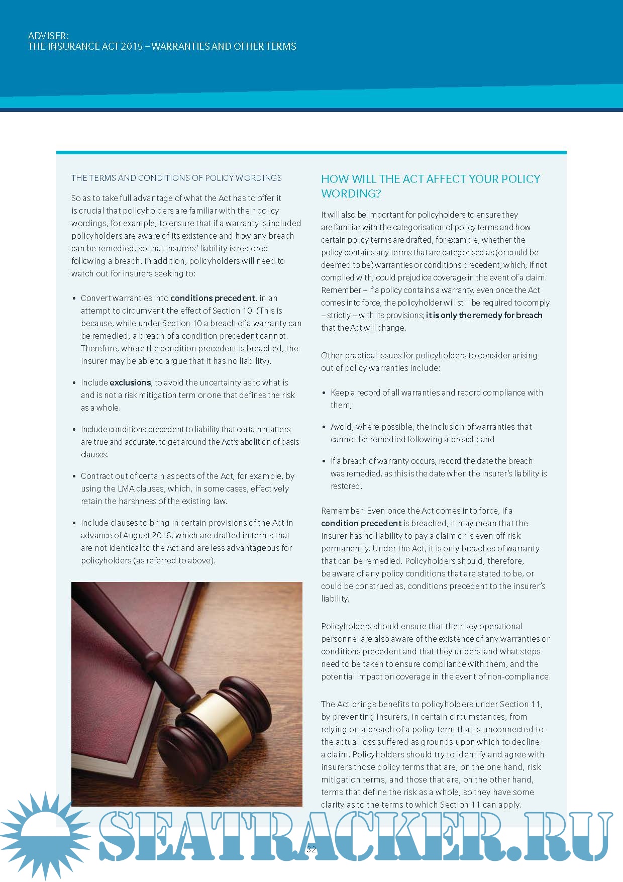 The Act redresses an imbalance in the existing law, which is sometimes overly in favour of insurers. For example, it abolishes basis of contract clauses; clarifies the insured’s duties relating to pre-contractual disclosure of information, and introduces fairer and more proportionate remedies for non-disclosure and breach of warranty. Here at Marsh, we look forward to helping you prepare for and reap the benefits of the Act.