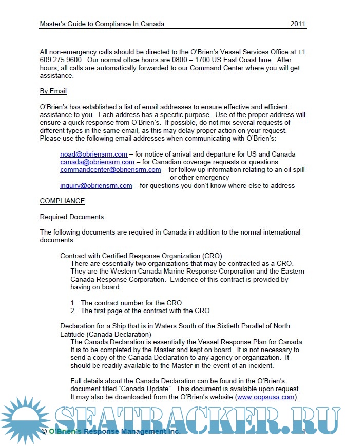 Description: The Master of any vessel making a call to Canada faces a number of issues that are specific to Canada. This guide is intended to help the Master effectively and efficiently face these issues. O’Brien’s Response Management Inc. (O’Brien’s) is providing this guide to help ensure your compliance. Use of the direction in this guide will allow O’Brien’s to better serve you.
