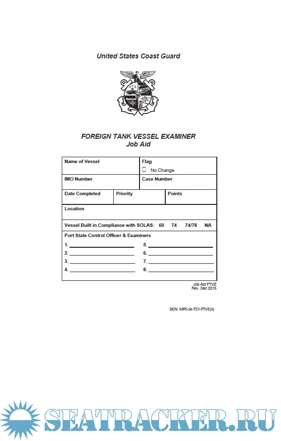 Year: 2016 Language: english Author: USCG Genre: Handbook Publisher: USCG Format: PDF Quality: eBook Pages count: 20 Description: This examination book is intended to be used as a job aid by Coast Guard port state control officers during boardings of foreign-flagged tank vessels. Each book contains an extensive list of possible examination items. It is not, however, the Coast Guard’s intention to “inspect” all items listed. As a port state responsibility, port state control officers must verify that the vessels and their crews are in substantial compliance with international conventions and applicable US laws. The depth and scope of the examination must be determined by the port state control officers based on their observations.