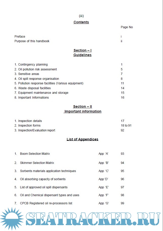 Year: 2006 Language: english Author: Indian Coast Guard Genre: Handbook Format: PDF Quality: eBook Pages count: 154 Description: Purpose of this handbook 1. The purpose of this handbook is to provide the most basic knowledge and practical guidelines to the CG units, ports and oil handling agencies for preparation of their oil spill contingency plan and its execution in an oil spill emergency. 2. It also provides user-friendly guidelines to maintain the stockpile of essential pollution response equipment, their upkeep, operational availability and utilization methodology. 3. The set of inspection forms annexed as part II of this handbook would be instrumental for development of an exclusive database on the sensitive areas, provide update on operational status routines carried out on the pollution response equipment and will help the authorities to institute a viable inspection procedures to ensure strict quality control at all times.