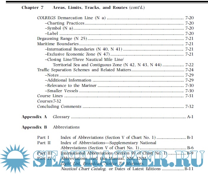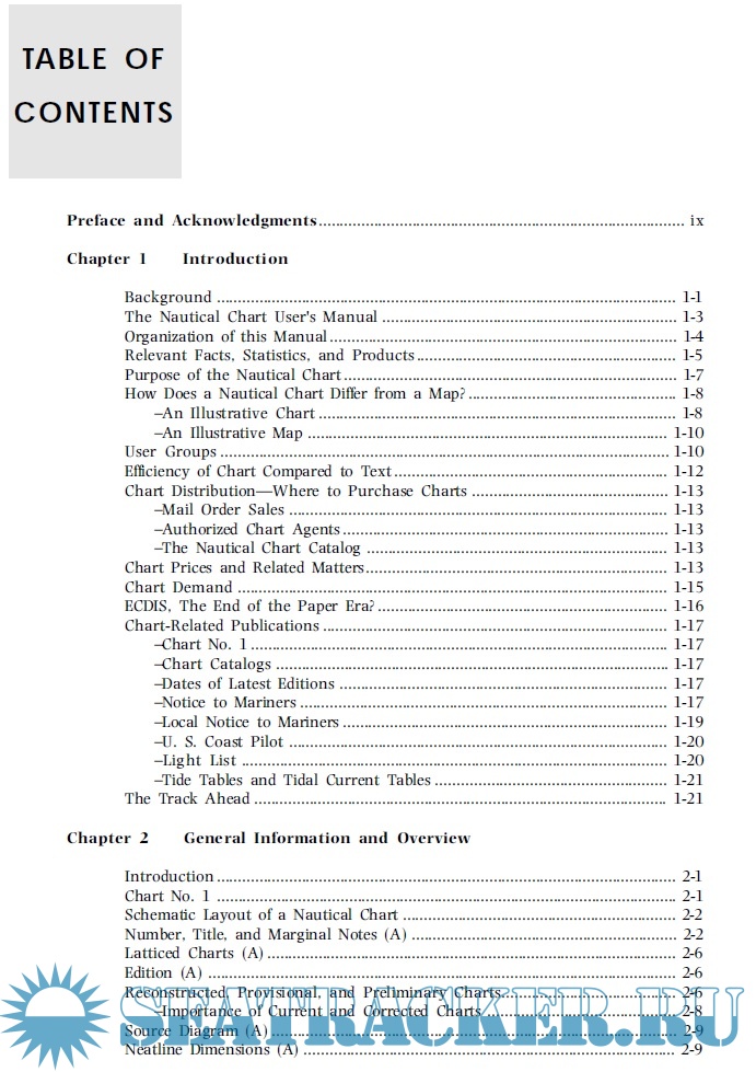 Year: 1997 Language: english Author: NOAA Genre: Manual Format: PDF Quality: eBook Number of pages: 304 Description: Many products are sold with users manuals. Some, such as those for an aircraft, automobiles, or pieces of electronic equipment, are quite voluminous and complex. Others are more modest. A patented insect destruction novelty device sold several years ago consisted of only two small wooden blocks. Even this novelty device came with a users manual; it consisted of a single sheet of paper with the following instruction, place insect on face of one block and firmly place second block on top of first block. Generally speaking, the more sophisticated and important the item, the more elaborate the users manual. The modern nautical chart is reasonably complex and certainly an essential tool for the mariner. Yet, aside from passing mention in textbooks on navigation and the publication of Chart No. 1, no users manual had been published for the nautical chart. Arguably, such a publication is long overdue. This manual explains what is presented on the nautical chart, highlights the utility of this information, describes the charting conventions used to depict features and items of interest, and provides some practical pointers on how this information is used. It is written to serve many types of users, ranging from operators of recreational vessels to those who drive heavy iron.