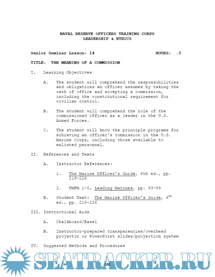 Year: 2002 Language: english Author: Chief of Naval Education And Training (CNET) Genre: Training courses Publisher: Chief of Naval Education And Training (CNET) Format: PDF Quality: eBook Pages count: 413 Description: This course curriculum was designed to ensure midshipmen gain a solid understanding of appropriate Leadership and Ethics standard before commissioning.