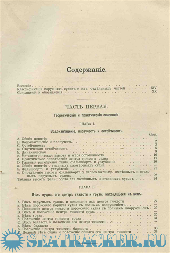 Во второй и третьей частях ее представлены, как чертежи, так и расчеты разных типов судов, (именно: водоизмещения, положений центра величины, метацентра и др.) их деталей рангоута и парусности.