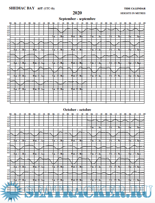 Tide tables include predicted times and heights of the high and low waters associated with the vertical movement of the tide. They're available in table, graphic and text formats for over 700 stations in Canada.