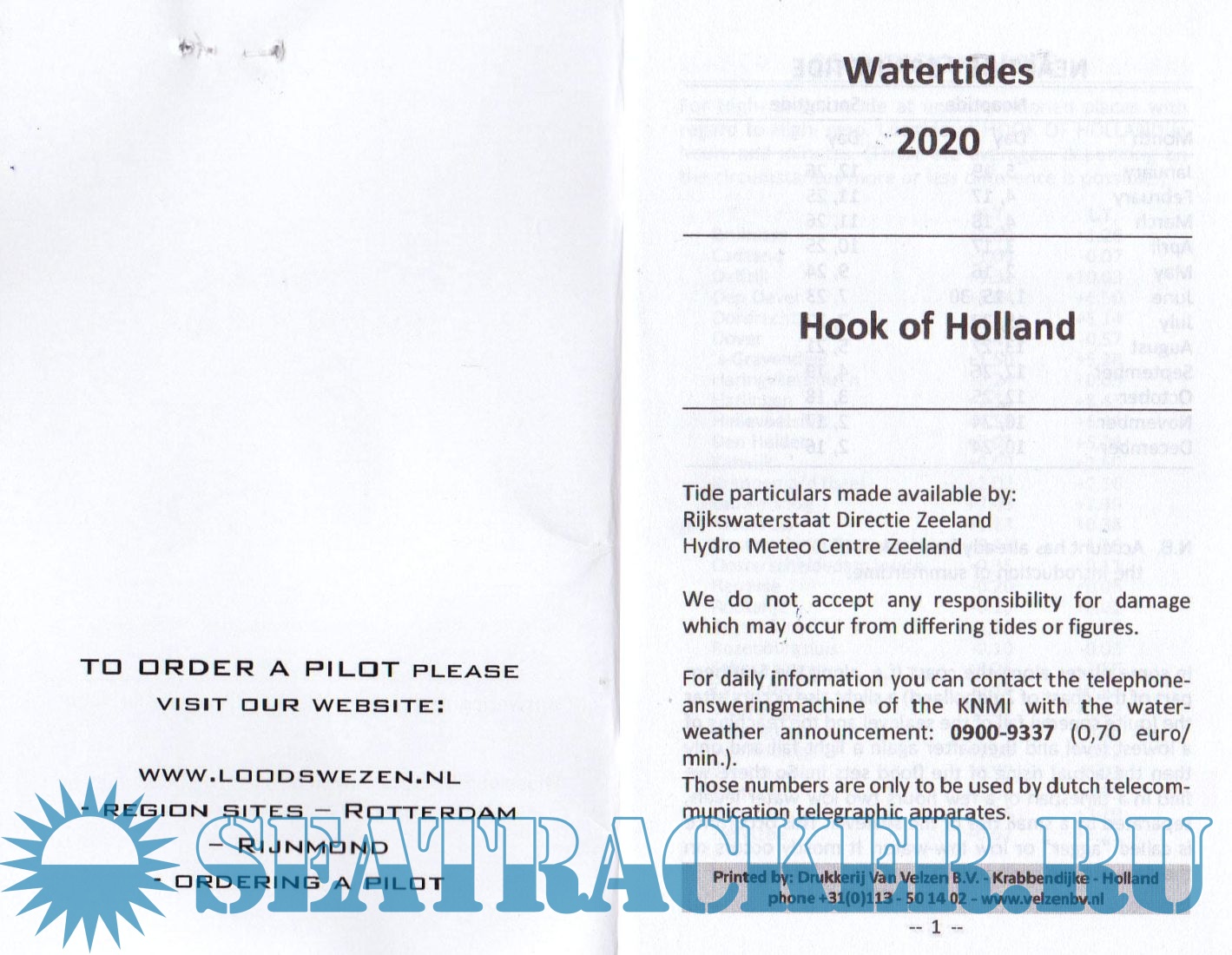 Description: Tide table for Hook of Holland, which is in use for tide calculation at Rotterdam Port. Booklet is published annualy by pilot service of Rotterdam-Rijnmond area.
