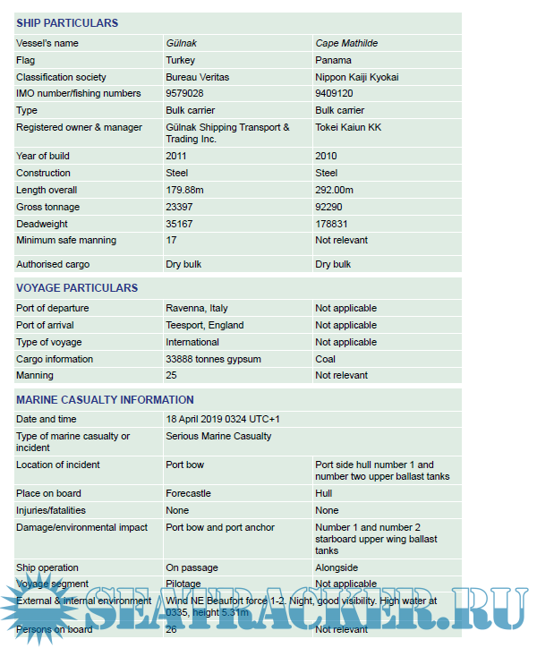 Description: Accident Investigation report for Collision between the bulk carrier Gülnak and the moored bulk carrier Cape Mathilde River Tees, England on 18 April 2019