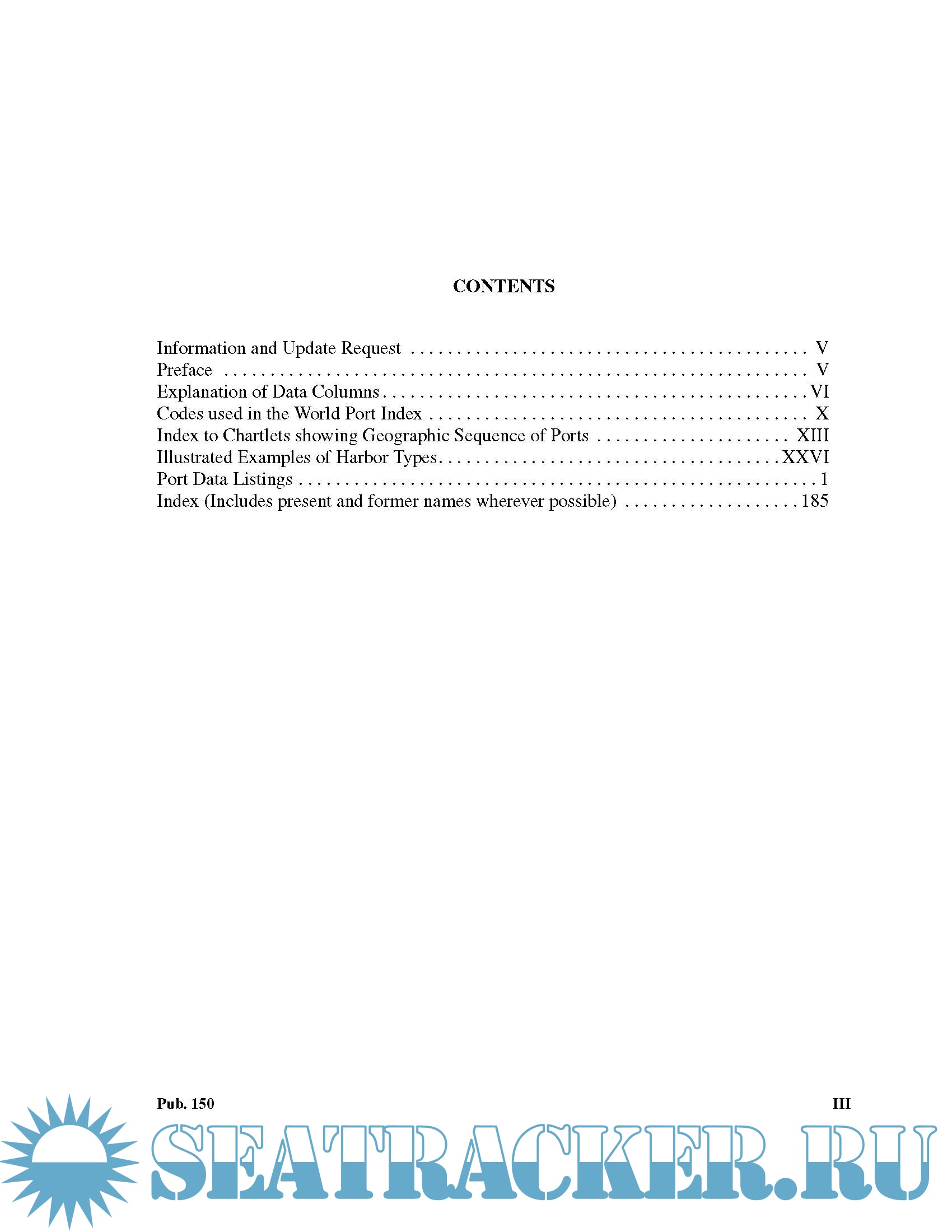 Description: The World Port Index (Pub 150) contains the location and physical characteristics of, and the facilities and services offered by major ports and terminals world-wide (approximately 3700 entries), in a tabular format. Entries are organized geographically, in accordance with the diagrams located in the front of the publication.