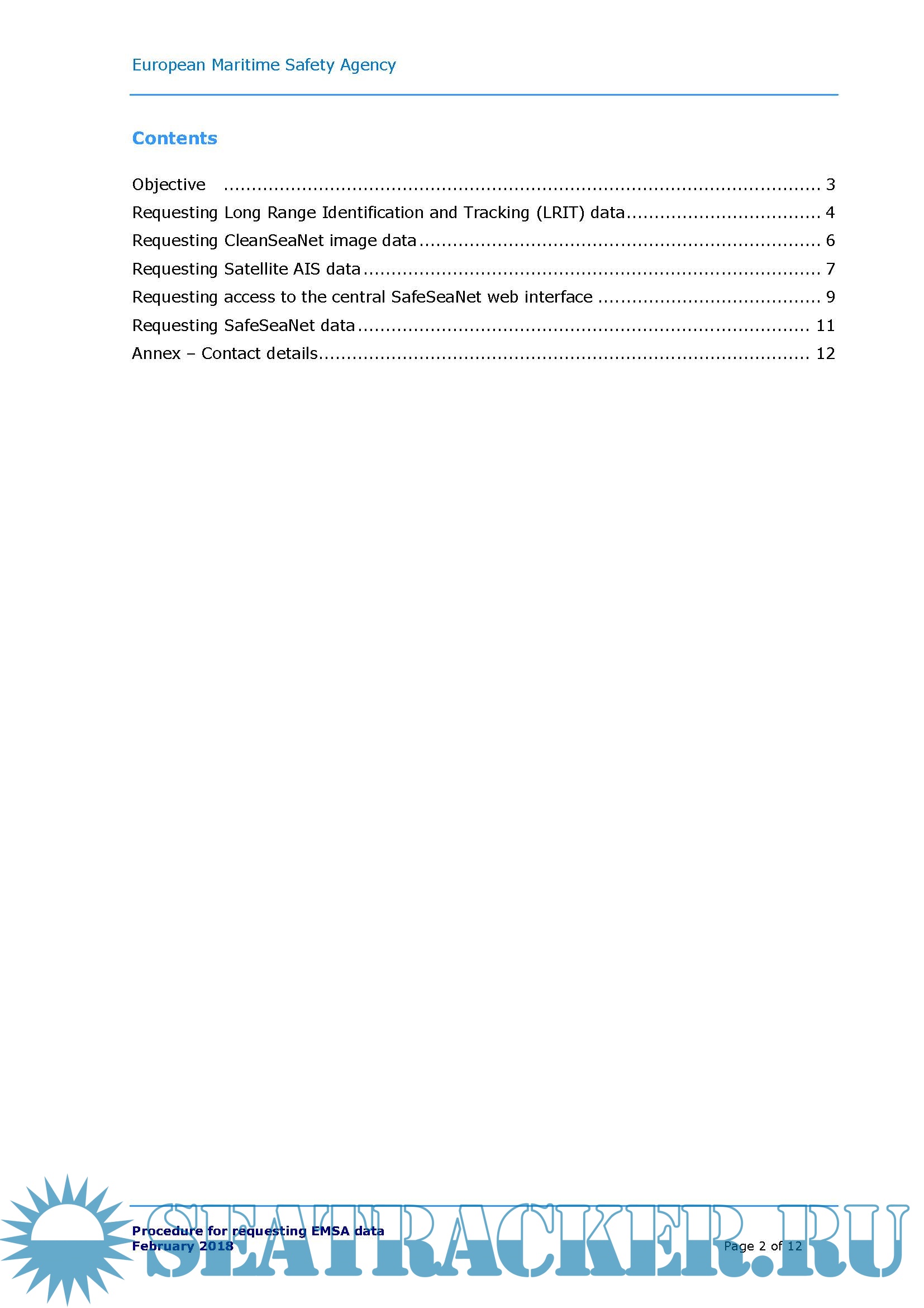 Year: 2018 Language: english Author: EMSA Genre: Guide Format: PDF Quality: eBook Pages count: 12 Description: The purpose of this document is to indicate the different procedures which have been established by the European Maritime Safety Agency (EMSA) to manage external requests for data from the EMSA applications (including Long Range Identification and Tracking [LRIT], SafeSeaNet, CleanSeaNet and Satellite AIS data). These requests are made by European Union (EU) Member State national government authorities and EU institutions and bodies, and by projects or programmes established by these parties and working on issues of public interest. For each specific data type, a different procedure is applied. The applicable procedures are described in this document, which provides the following information: What data are available; How to apply; Conditions for obtaining access to or receiving the data; What happens once a request has been approved.