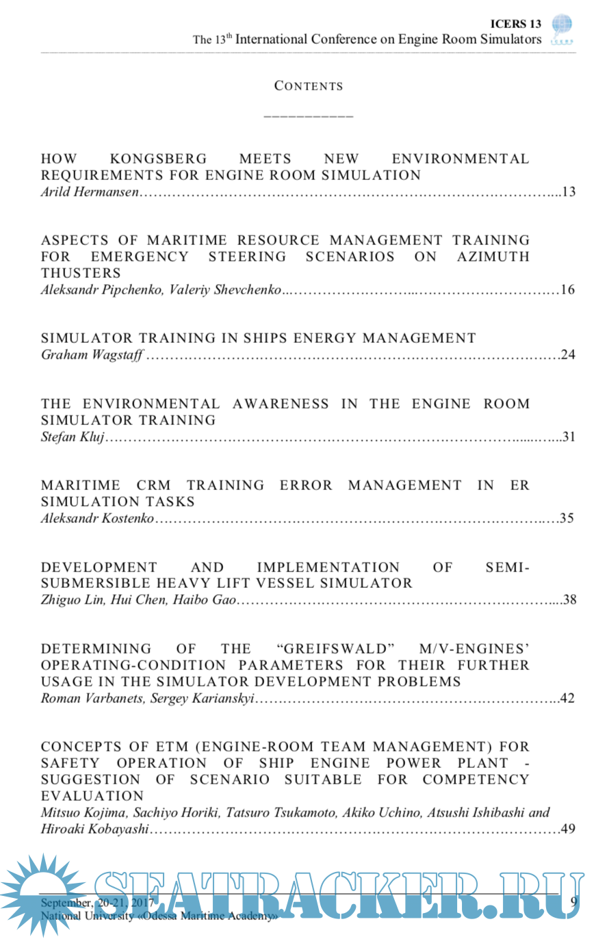 Description: Holding of ICERS13 provides a unique opportunity to exchange experience among professionals involved in production and operation of marine engines, mechanisms and systems, creation and use of engine room simulators in marine engineers training.