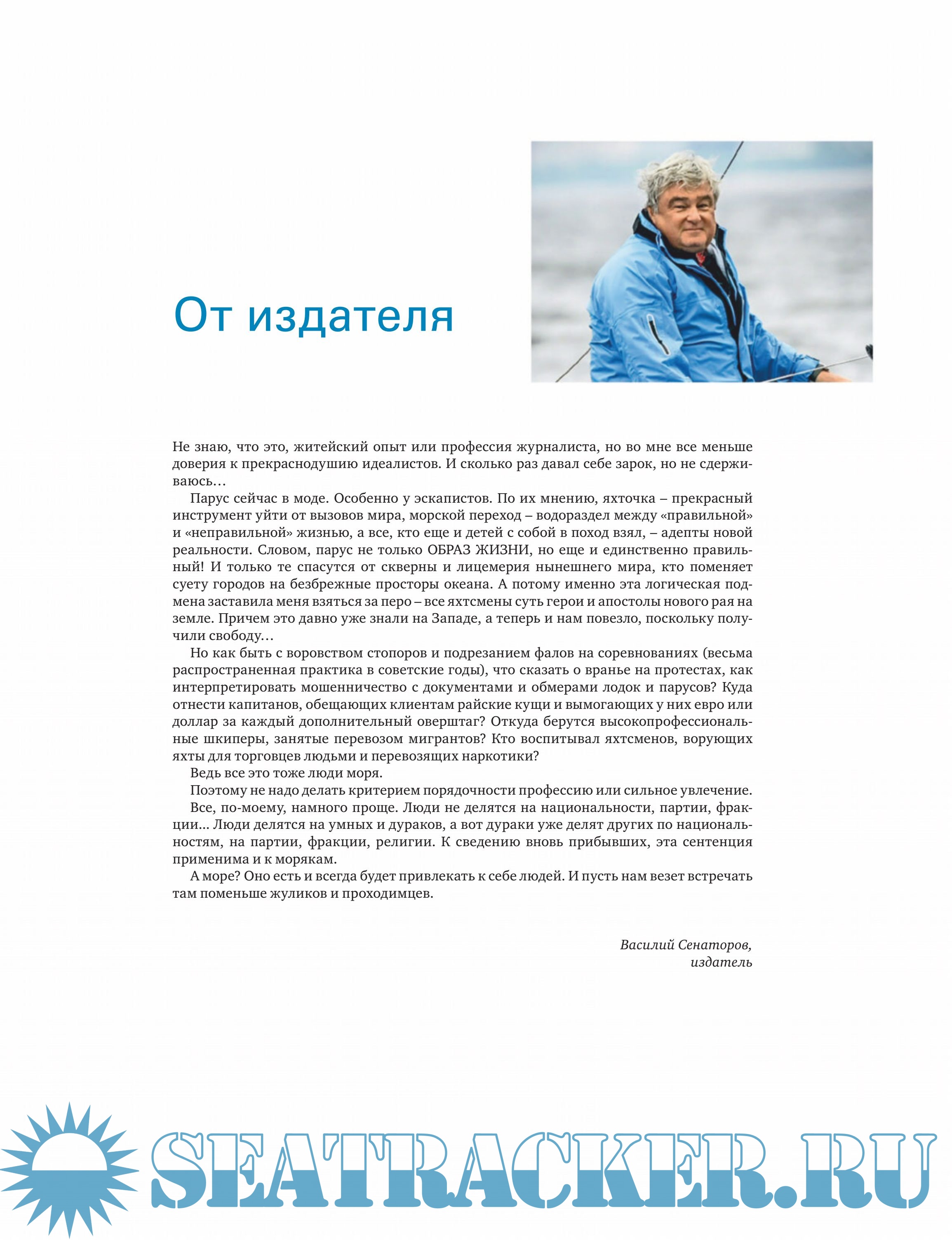Год выпуска: 2017, 2018-2019 Язык: русский Автор: Василий Сенаторов (издатель), Артур Гроховский (гл. ред) Жанр: Периодическое издание (журнал) Издательство: Yacht Russia по лицензии Delius Klasing Gmbh Формат: PDF Качество: Отсканированные страницы + слой распознанного текста Количество страниц: 100+ Описание: Журнал Yacht Russia – партнер знаменитого немецкого журнала Yacht, самого старого регулярного европейского издания о парусном спорте. Выходящий с 1904 года Yacht, сегодня имеющий тираж более 100 000 экземпляров, нашел в лице Yacht Russia достойного партнера, оперативно информирующего читателей обо всех актуальных проблемах жизни мирового и российского паруса. Доп. информация: в дополнение к раздаче коллеги SerTan: https://seatracker.ru/viewtopic.php?t=32832