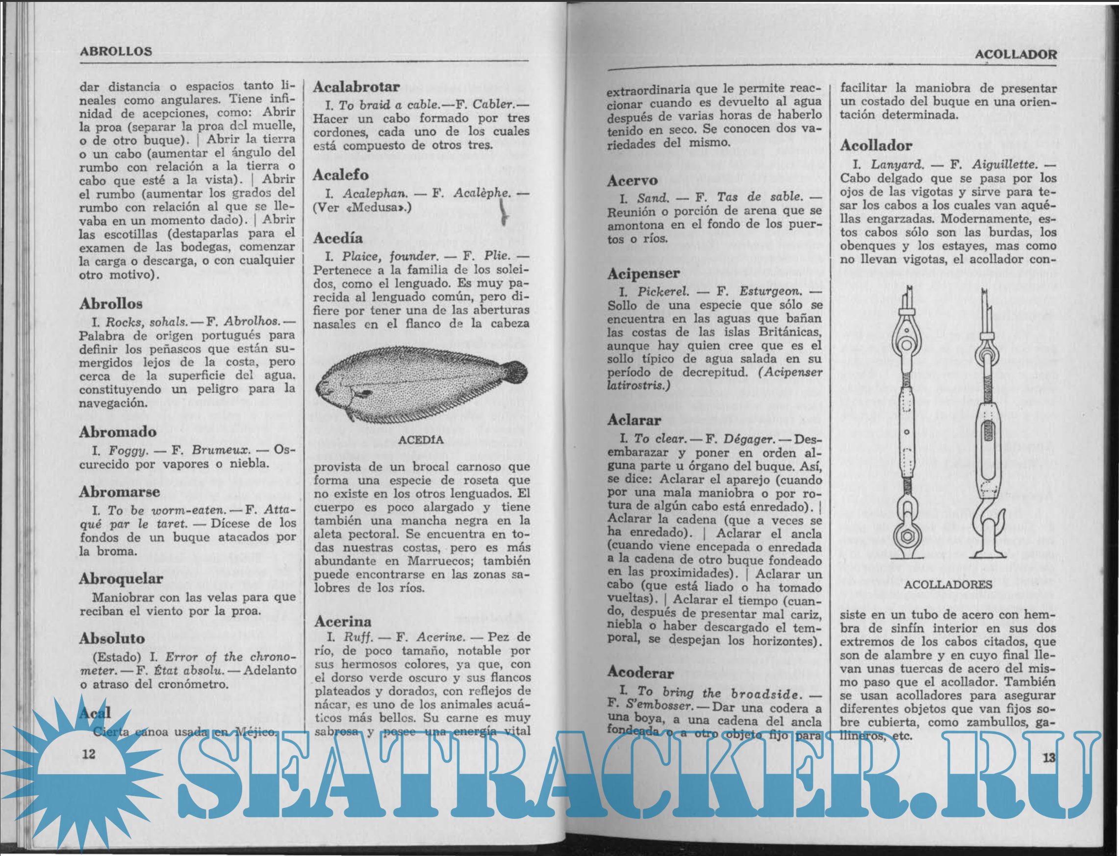 Reading this book can be viewed as a pleasant pastime, without prejudice to its basic function: To resolve questions that may be offered to every professional amateur of activities related to the sea. The vocablos lead their English and French translation, and, to the greatest ease of the reader, they appear at the end of this vocabulary book in those languages. The maritime dictionary does not apply only to the description of all kinds of ships, nautical apparatus, art of sailing, astronomy and maritime meteorology, international co-operation of signals, manoeuvres, winches, ropes and so many other important maritime concepts; it would have been incomplete if it failed to include a description of the species of fish caught in our seas, as well as the fishing nets and gears used therein.