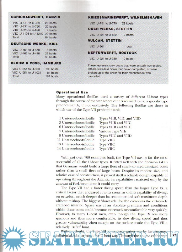 The operational history section includes examples from the Classes Type VIIA, Type VIIB, VIID, VIIE and VIIF before concentrating on the mainstay of the U-boat arm, the Type VIIC. Comparisons are also made with the standard allied submarines, their strengths, weaknesses and U-boat tactics.