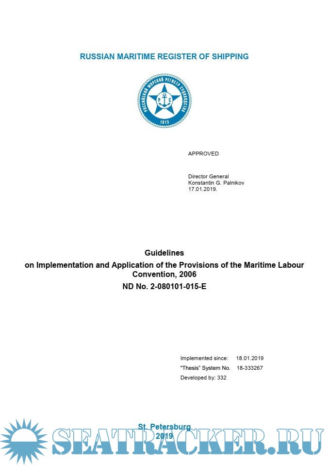 - Руководство по внедрению и применению положений Конвенции 2006 года о труде в морском судоходстве (2-080101-015); - Guidelines on Implementation and Application of the Provisions of the Maritime Labour Convention, 2006 (2-080101-015-E).