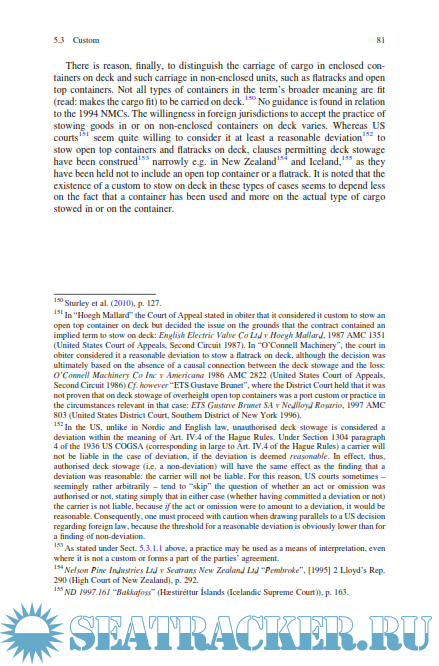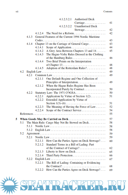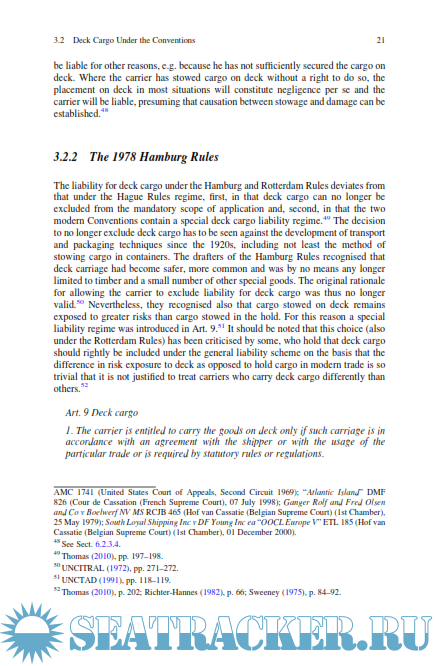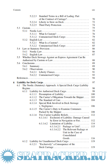 The complexity of the problem stems from the way in which the deck has, over the years, gradually become a common place to stow cargo. When the Hague Rules were introduced in 1924, deck stowage was an absolute exception due to the great risks involved. As such, the topic must first be looked at in the context of the shipping realities in which the Hague Rules were drafted and then in terms of today’s shipping realities. The comparative analysis leading up to the author’s conclusions and general remarks for future legislation consists of two parts, the first dealing with the situations in which the carrier is permitted to stow cargo on deck, and the second with the carrier’s liability for deck cargo where he has stowed cargo on deck with, or as the case may be, without such permission.