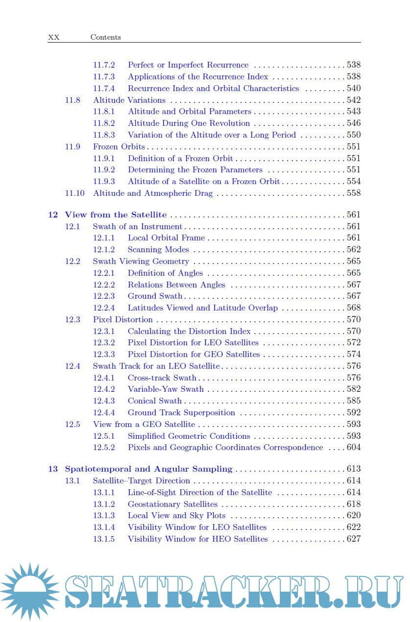- Chapters 12 and 13 consider the instruments carried aboard the satellite from a geometrical point of view. From the different ways of observing the Earth from a satellite, to the conditions under which a given point on the Earth can view the satellite, considering the viewing angle and frequency of visibility.