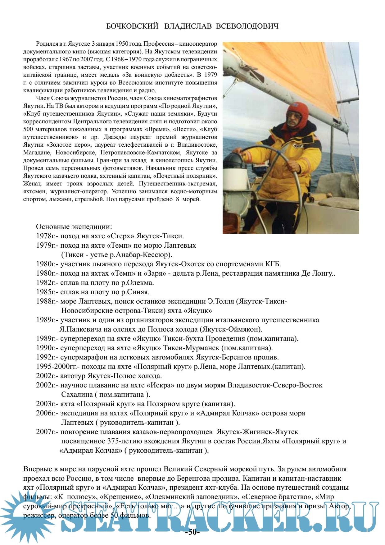 Доп. информация: Владислав Бочковский был известным яхтсменом, режиссёром и оператором более полусотни документальных фильмов. Одних материалов, использованных в передачах на центральных телевизионных каналах, таких как «Время», «Вести», «Клуб путешественников» и другие, подготовлено им более 500 штук. Участник и руководитель множества экстремальных экспедиций, парусных походов. Член Союза журналистов России, член Союза кинематографистов Якутии. На ТВ был автором и ведущим программ «По родной Якутии», «Клуб путешественников Якутии», «Служат наши земляки». Будучи корреспондентом Центрального телевидения снял и подготовил около 500 материалов показанных в программах «Время», «Вести», «Клуб путешественников» и др. Был дважды лауреатом премий журналистов Якутии «Золотое перо», лауреатом телефестивалей в г. Владивостоке, Магадане, Новосибирске, Петропавловске-Камчатском, Якутске за свои документальные фильмы, получил гран-при за вклад в кинолетопись Якутии, был удостоин звания «Почетный полярник», провел семь персональных фотовыставок, был даже начальником пресс службы Якутского казачьего полка, и конечно же он был Яхтенным капитаном.