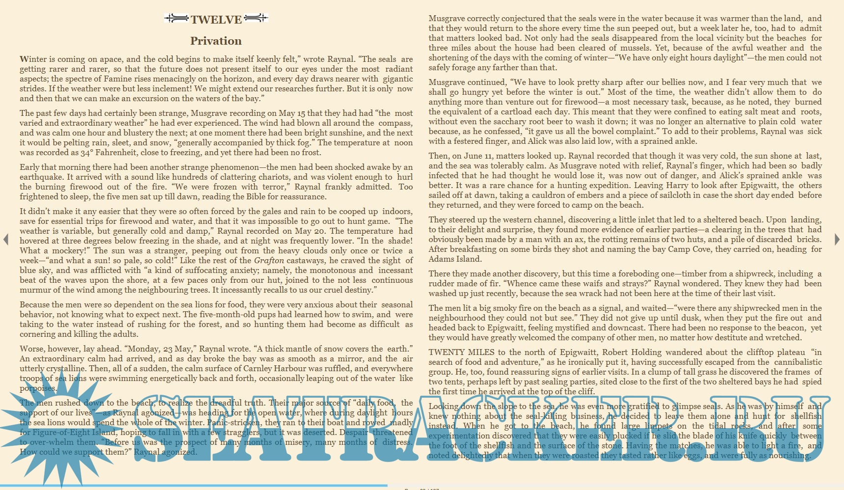 Description: Auckland Island is a godforsaken place in the middle of the Southern Ocean, 285 miles south of New Zealand. With year-round freezing rain and howling winds, it is one of the most forbidding places in the world. To be shipwrecked there means almost certain death. In 1864 Captain Thomas Musgrave and his crew of four aboard the schooner Grafton wreck on the southern end of the island. Utterly alone in a dense coastal forest, plagued by stinging blowflies and relentless rain, Captain Musgrave inspires his men to take action. With barely more than their bare hands, they build a cabin and, remarkably, a forge, where they manufacture their tools. Incredibly, at the same time on the opposite end of the island, the Invercauld wrecks during a horrible storm. Nineteen men stagger ashore. Unlike Captain Musgrave, the captain of the Invercauld falls apart given the same dismal circumstances. His men fight and split up; some die of starvation, others turn to cannibalism. Only three survive. Musgrave and all of his men not only endure for nearly two years, they also plan their own astonishing escape, setting off on one of the most courageous sea voyages in history.