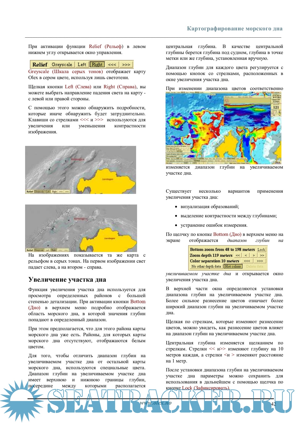 Описание: Система трехмерной электронной картографии Olex сочетает в себе возможности навигации по векторной карте, построение рыболовных планшетов и трехмерное представление рельефа морских глубин. Olex позволяет отображать рельеф грунта в двух разных видах, делая рыбный промысел более экономичным и эффективным. Новейший метод картографирования морских глубин Olex создает объемную карту глубин на основании текущих данных эхолота и GPS. Каждое последующее измерение глубины делает карту более точной. Построение карты является непрерывным и автоматизированным. Объем данных, с которым работает Olex, неограничен.